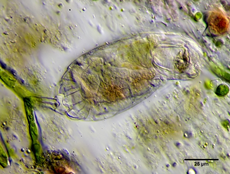 in einem ca. drei Monate altem Mikroaquarium kam es zu einer Massenentwicklung des Rädertiers Lecane inermis BRYCE 1892. Da ich schon länger vorhatte, die Embryonalentwicklung eines Rädertieres mit der von Gastrotrichen zu vergleichen, habe ich die Gelegenheit genutzt und ein  Ei von der Eiablage bis zum Schlupf des Jungtiers mit 50-fachem Zeitraffer zu filmen. Leider erwies sich die Entwicklung von Rädertieren und Gastrotrichen als so unterschiedlich, dass sich die Gemeinsamkeiten in einem Satz zusammenfassen lassen: