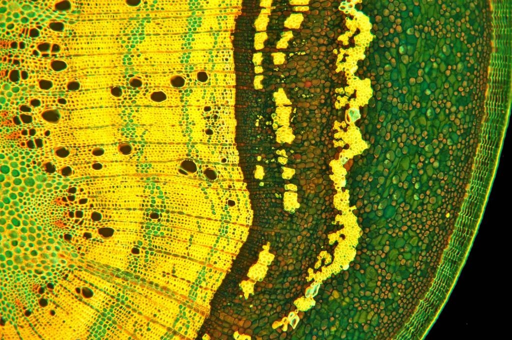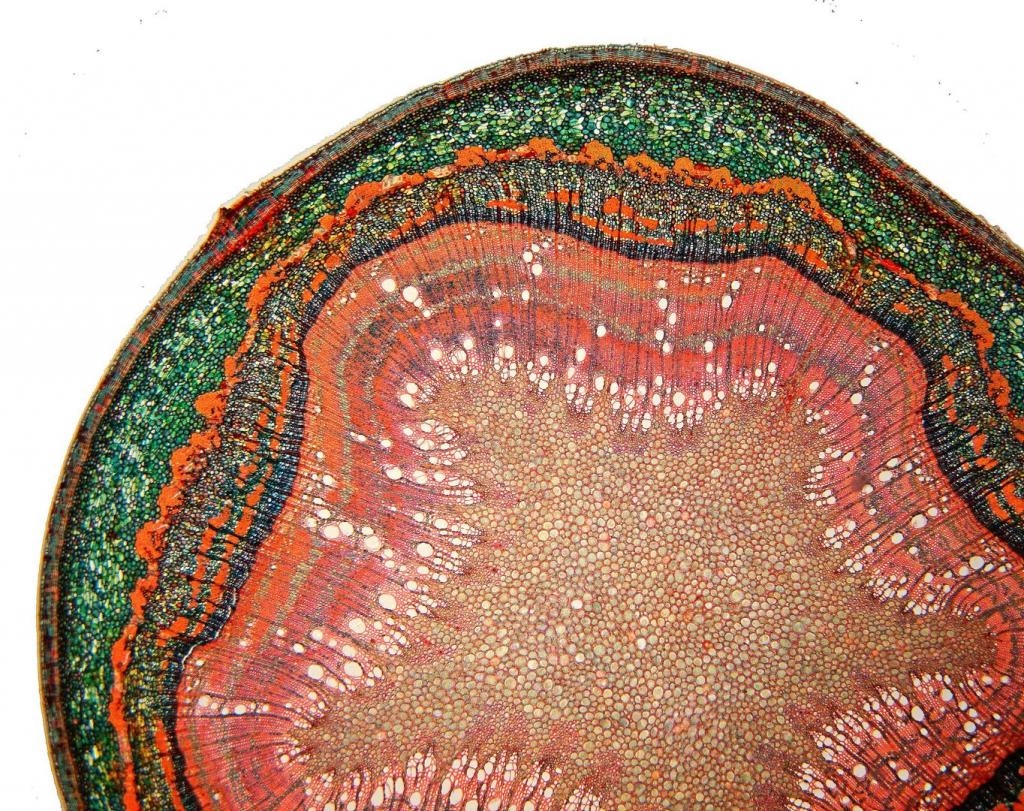 T = Trachee, MP = Markparenchym, XY = Xylem, ST = Strahl, K = Kanbium, PH = Phloem, SK = Sklerenchym, RP = Rindenparenchym, PE = Periderm