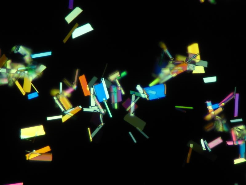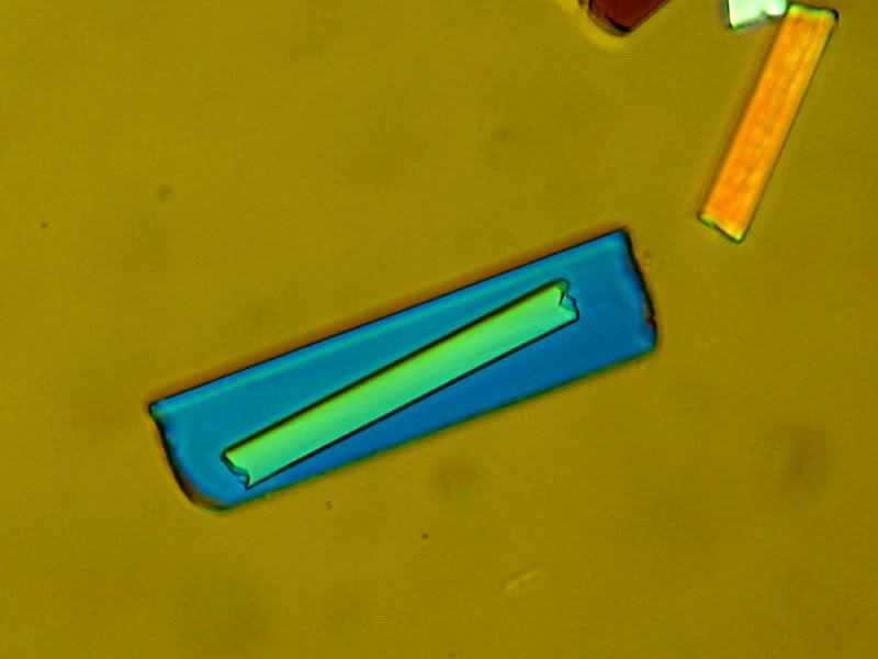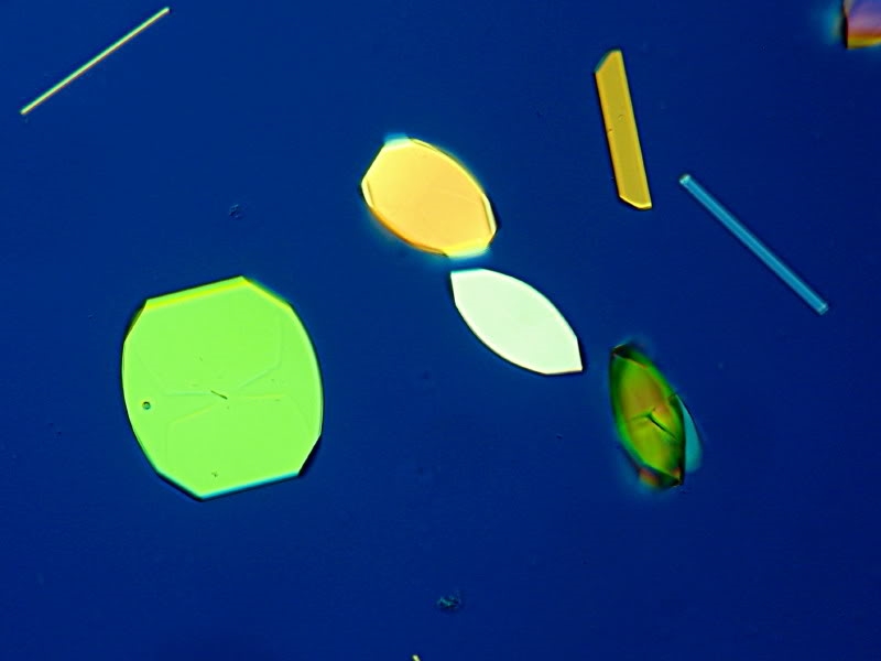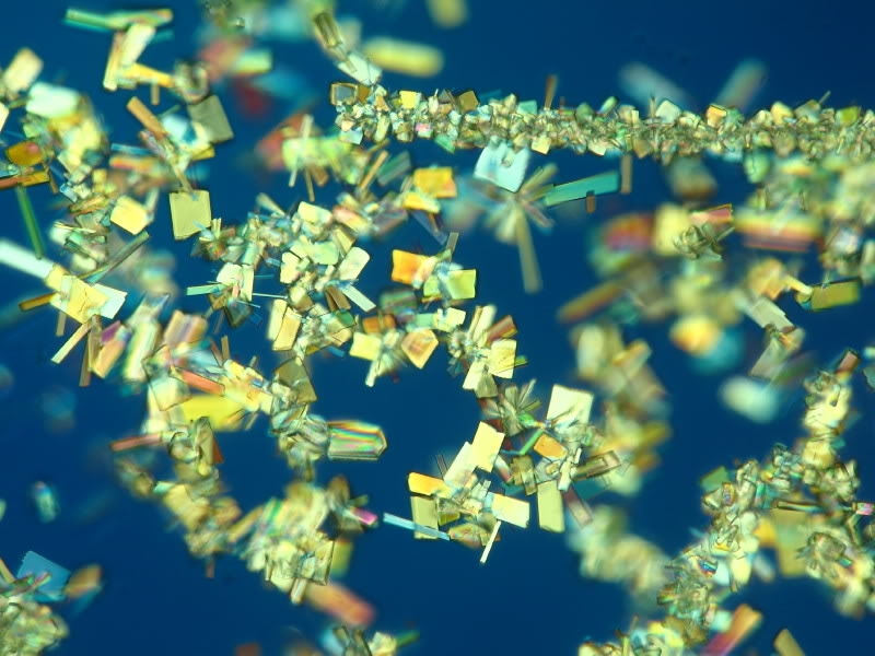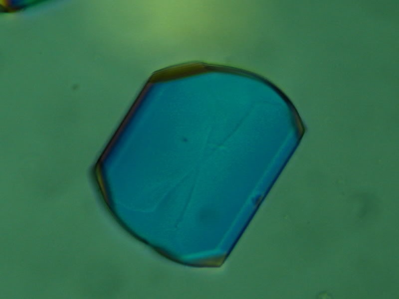 nicht nur im Wein, sondern auch im Crémant kann man Weinstein (Kalium Hydrogen-Tartrat) finden. Da die Flasche leer war und meine Frau meinte, dass es reicht ;D habe ich mich mit meinem Glas ins Labor verzogen. Die Kristalle sahen unterm Mikroskop wenig attraktiv aus. Ein Blick in den Römpp sagte mir, dass die großen Löslichkeitsunterschiede in heiß/kaltem Wasser eine Umkristallisation einfach machen werden. So war es auch. Und die Kristalle sahen nun deutlich besser aus.