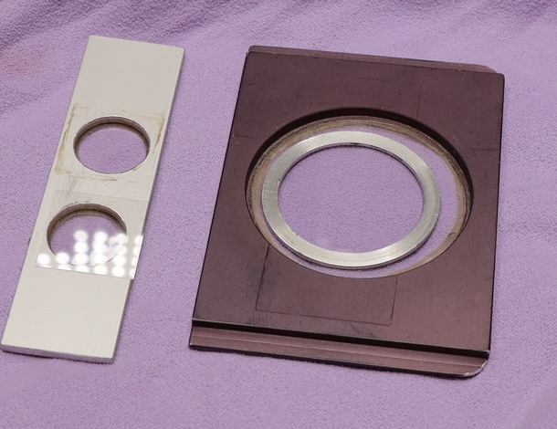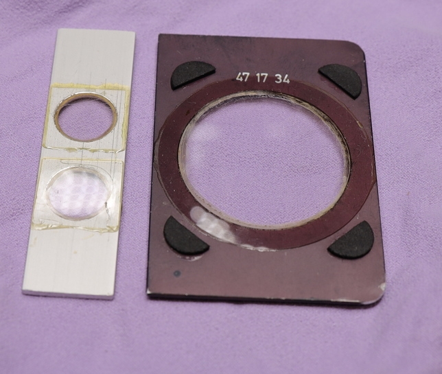Links ist ein Stück eloxierter Alustreifen (2 mm dick) vom Baumarkt, mit zwei Bohrungen auf die mit UHU-Plus Deckgläser geklebt sind. Dieses feste Verkleben gibt den dünnen Glasböden eine verblüffende Festigkeit - vor allem wenn man die Küvetten reinigen will.