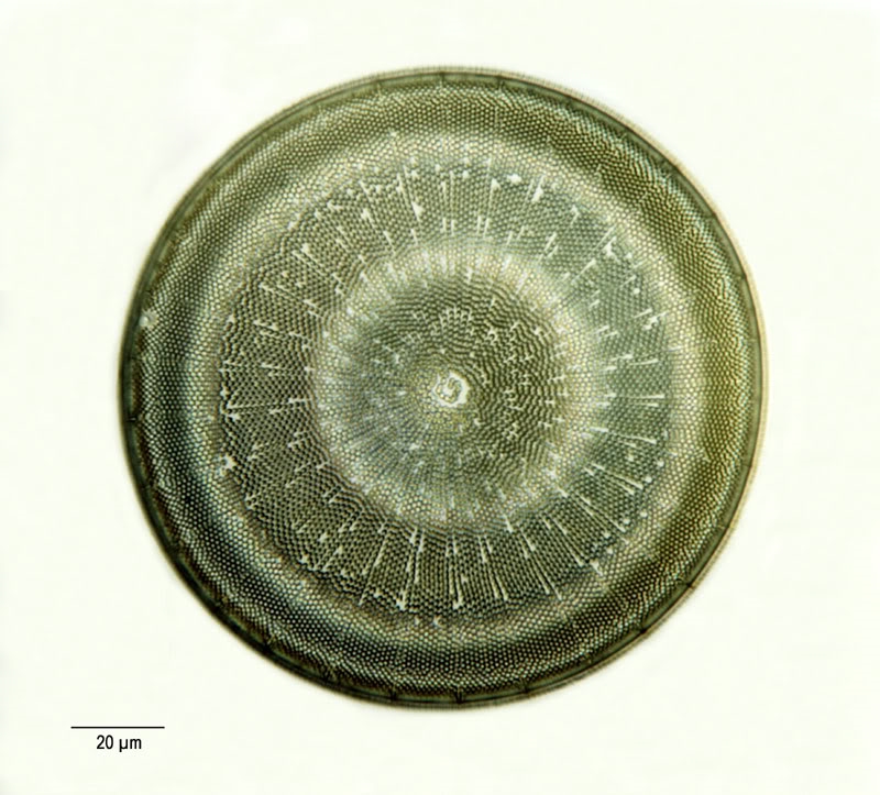 eine weitere Diatomee von einer Typenplatte von Ralf Nötzel, Actinocyclus ehrenbergii. Sie stammt aus Jewell, Maryland (USA) und ist eine rezente Meerwasser-Diatomee. Durchmesser: 140 µm.