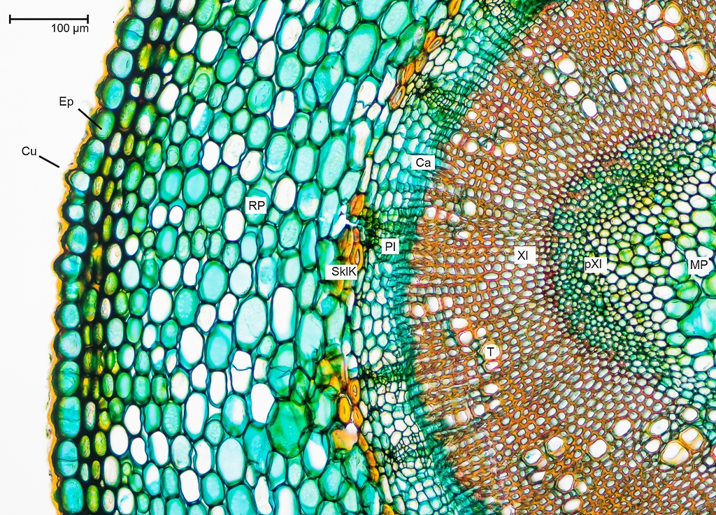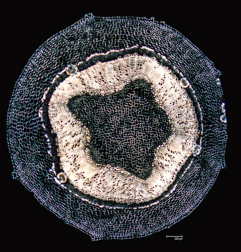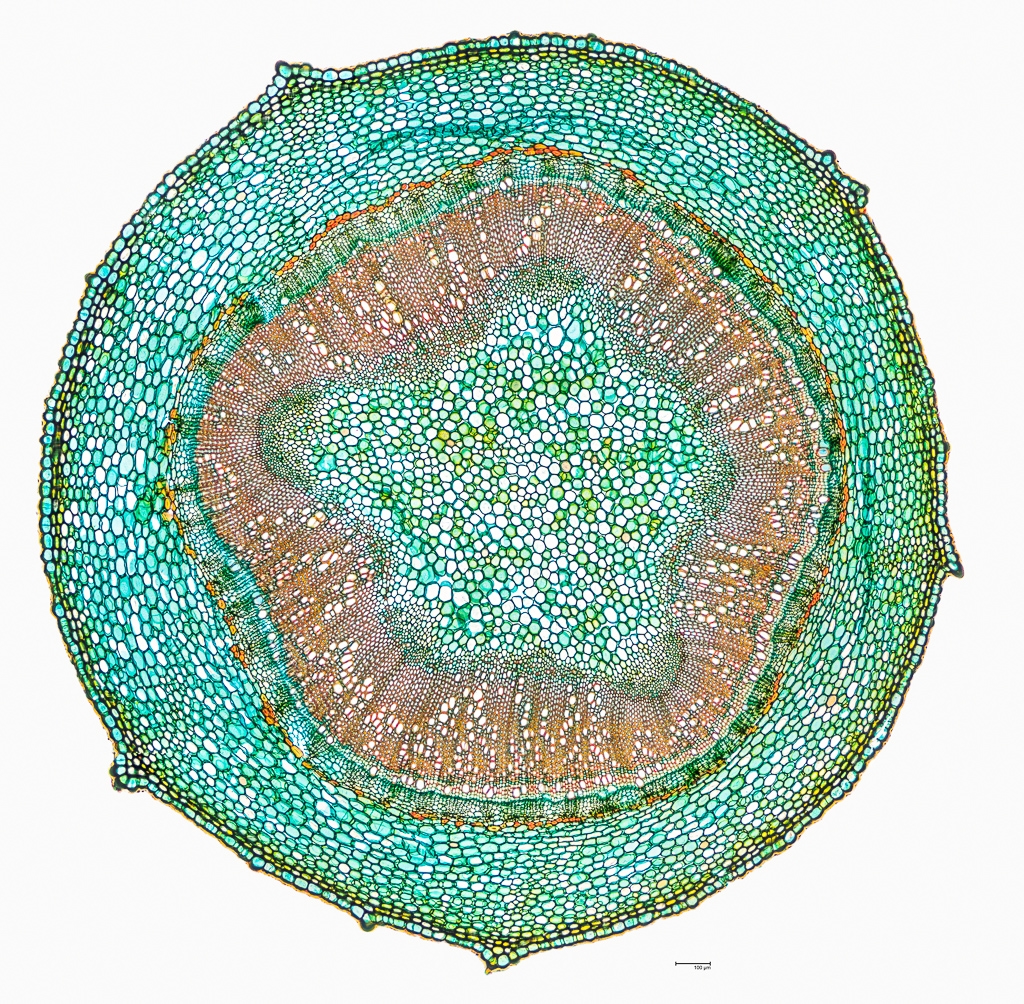 Nun eine weitere Probe, diesmal aus dem mehrjährigen Teil des Sprosses. Auch diese Probe war problemlos auf 30µm Dicke zu schneiden. Dieser Sprossteil sieht makroskopisch anders aus, hat keine Laubblätter, ist braun und könnte optisch auch als Rhizom durchgehen. Auch hier (Bild 33 bis Bild 35) zunächst eine Übersicht eines ungefärbten Schnitts. Da in diesem Bereich keine Laubblätter (mehr) sind, ist der Xylemring nicht mehr unterbrochen, außerdem ist dieser dicker geworden.
