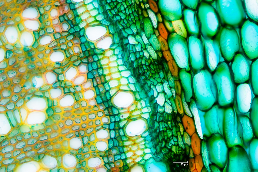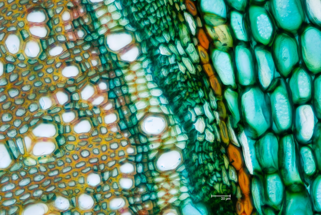 Wenn man sich die Frage stellt, was genau eigentlich für die beobachteten grünen Primärfluoreszenzen verantwortlich ist, liest man zwar überall ,,Lignin" (für die verholzten Bereiche, insbesondere des Xylems und des Sklerenchyms) und ,,Cutin" (für die Cutina), im Details ist es aber wohl gar nicht so trivial. Fachliteratur weist immer wieder darauf hin, dass die chemische Natur dieser Fluoreszenzen nicht vollständig geklärt ist und zumindest ältere Arbeiten anhand von Modellverbindungen eigentlich nur die UV-Anregung nachvollziehen können.[6-8] Eine aktuelle Theorie besagt, dass erst durch die räumliche Anordnung der entsprechenden Stilben- und verwandten Einheiten und der Bildung von Aggregaten die beobachtete Fluoreszenz verursacht wird.[9]