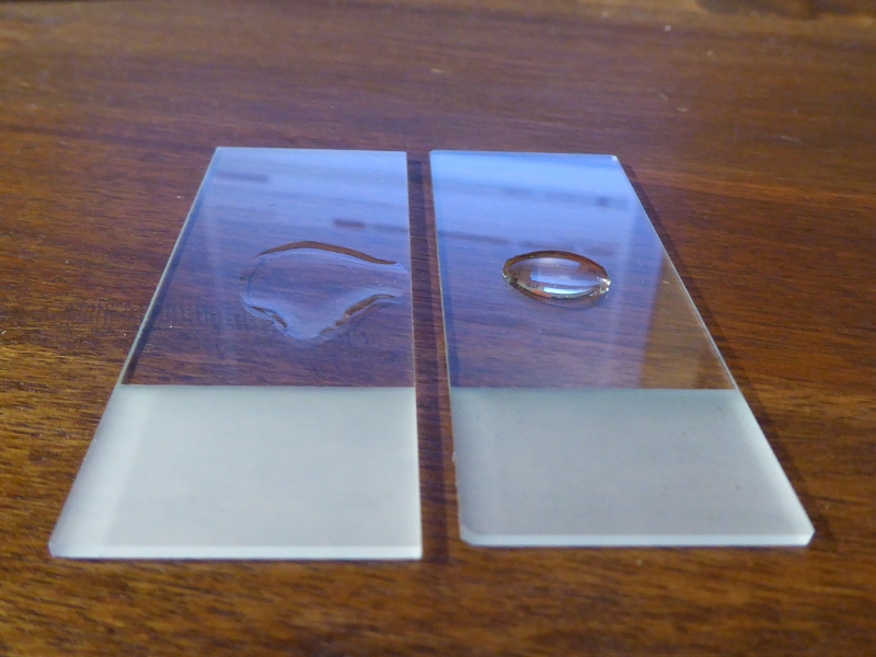ich benutze die Methode des Abflammens, wenn ich einen (Wasser-)Tropfen schön verlaufen lassen will, z.B. um um ein Diatomeenstreupräparat herzustellen. Hier ein Vergleichsfoto, das die wesentlich bessere Benetzbarkeit der Glasoberfläche zeigt: