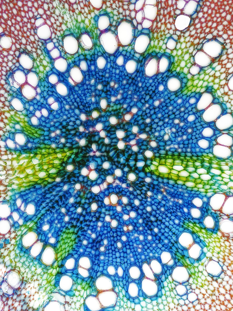 Die Beschriftung ist tatsächlich nicht ganz einfach, da die aufnahmen "nur" das Zentrum der Wurzeln zeigen. Die blauen Zellen wären dann das Metaxylem, die roten das Xylem - immer davon ausgehend, dass hier ein /sekundäres?) Dickenwachstum vorliegt. In beiden Bereichen finden sich Tracheen. Grüne Zellen könnten zu Strahlen oder zu Seitenwurzeln gehören.
