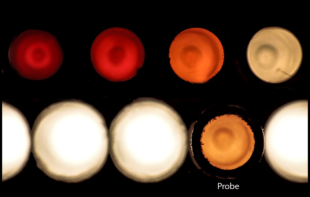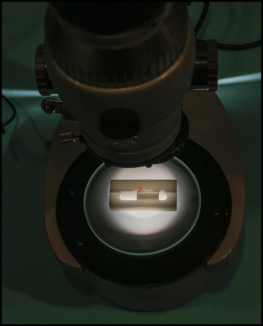 das heißt bei maximal einem Zweihunderstel der Menge für ein normales Photometer. In der üblichen Kuvette stünde die Flüssigkeit