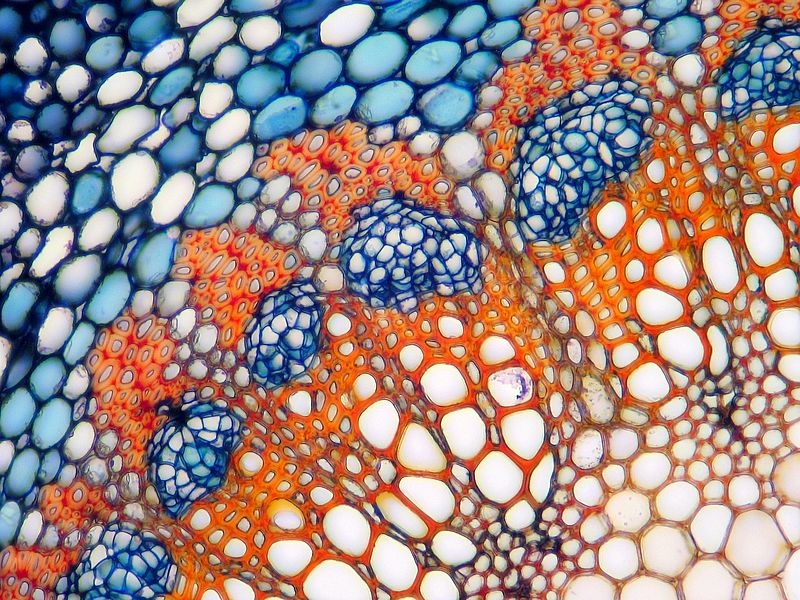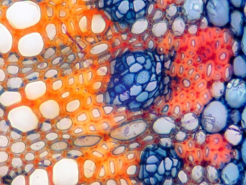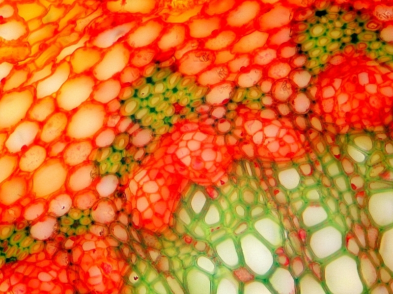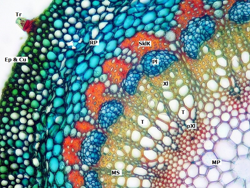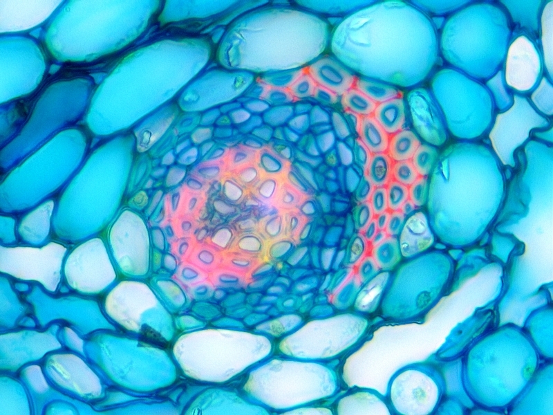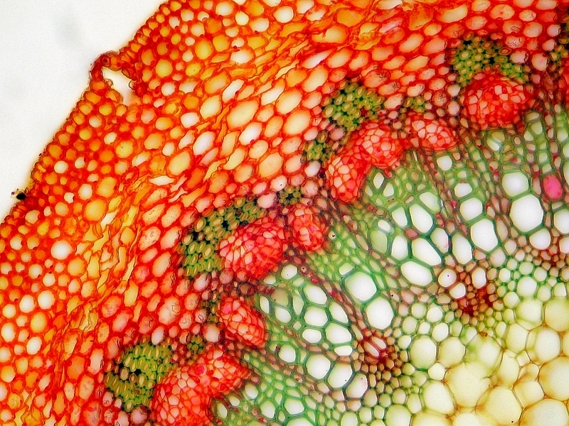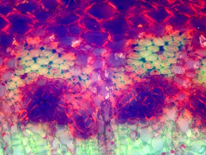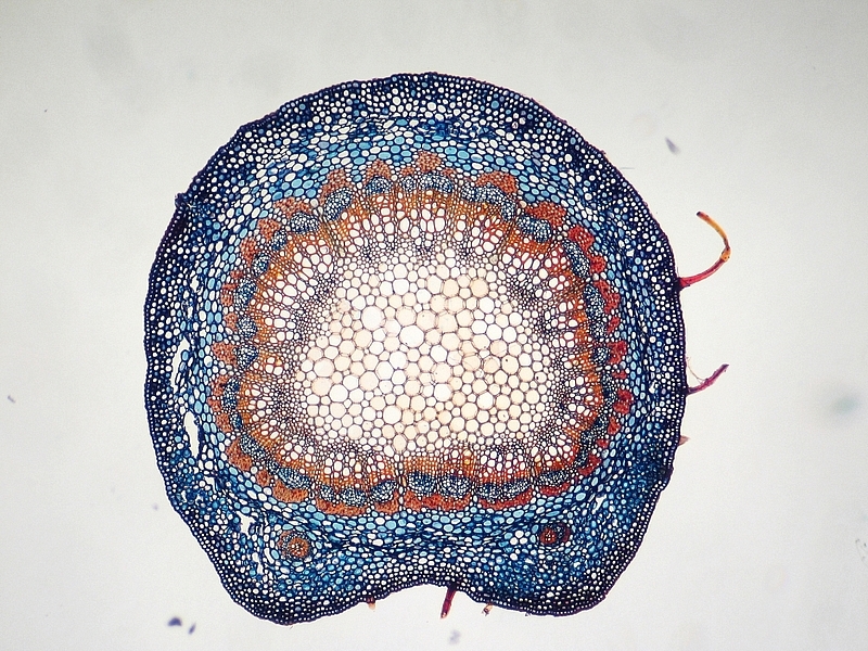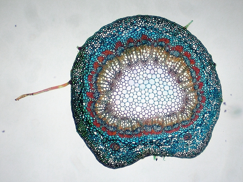 Die Färbung besticht meines Erachtens durch Ihre frischen Farben und die gute Differenzierung der Leitbündel. Hier nicht im Bild: auch die Cuticula wird vom Chrysoidin gut angefärbt. Besonders, wenn der Färbeansatz erwärmt wurde.