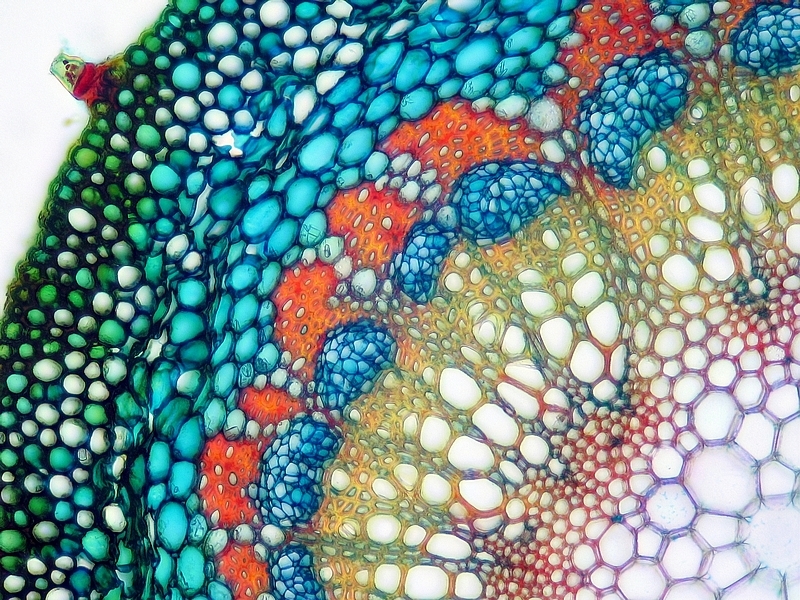 hier möchte ich nochmal den quergeschnittenen Blattstiel der Esche zeigen, diesmal mit einer von Rolf-Dieter Müller auf Basis der Safranin/Astrablau Färbung ersonnenen Dreifachfärbung Safranin/Astrablau/Chrysoidin (Müller SAC), die im Vergleich zur bekannten Zweifachfärbung lignifizierte Zellwände noch deutlicher differenziert.