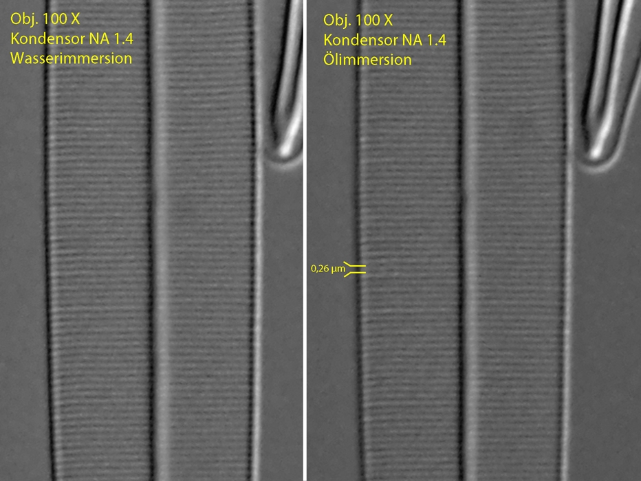 Die Auflösung verschlechtert sich also von theoretisch möglichen 0,203 µm auf 0,217 µm, was einer Reduktion von nur 7 % entspricht. Das ist weniger, als ich dachte. Aber das ist die Theorie! Wie sieht es in der Praxis aus. Für eine objektive Beurteilung habe ich die Schale von Amphipleura pellucida sowohl mit Ölimmersion als auch Wasserimmersion des Kondensors aufgenommen. Am restlichen optischen System und am Objekt wurde nichts geändert. Wie sich herausstellte, kann die Schalenstruktur mit beiden Immersionsmedien einwandfrei aufgelöst werden: