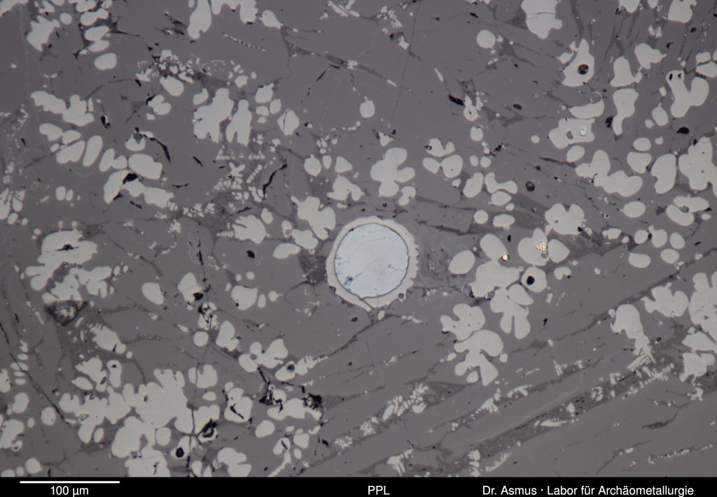 Gut aufgepasst Florian! Das  Bild mit dem Wüstit ist rausgeflogen, nachdem ich den Text geschrieben hatte....Nur weil es noch Sulfideinschlüsse gibt, heisst das nicht dass es kein Rösten gab. Nicht alle Erze wurden immer tot geröstet. Die hellgraue Phase ist der Wüstit.
