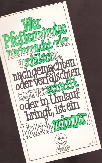Wer Minze fälscht oder nachmacht oder nachgemachte oder gefälschte Minze in Umlaufbringt, wird mit Malventee nicht unter 5 Tassen bestraft.