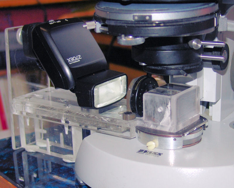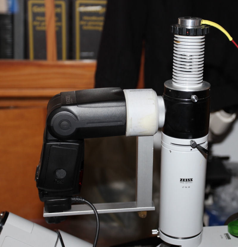 Mit der digitalen Fotografie hat sich die ,,Blitzerei" am Mikroskop sehr verändert. Problemloses TTL-Fotografieren mit Blitz gibt es nicht mehr. Dafür gibt es aber sofort zur Verfügung stehende Ergebnisse und die Möglichkeit der Teilleistungseinstellungen am externen Blitzgerät.
