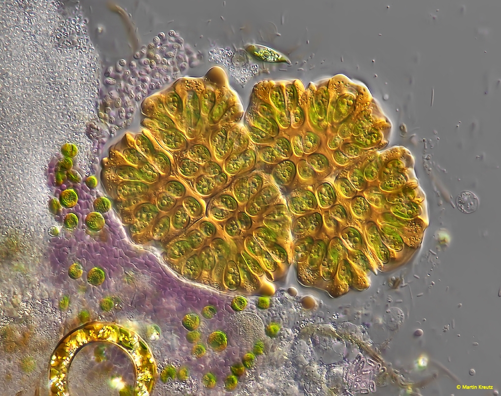 @Ole: Ich kann mich noch dumpf erinnern, wie ich das "Korallenriff" abgelichtet habe. Das Foto ist vom November 2019. Habe mich über einen Klumpen Rhodobakterien geärgert, der verhinderte, dass ich die Schichtdicke verringern konnte. Ich wollte das Präparat gerade entsorgen, als ich am Rand des Klumpens die Botryococcus sah. Ganz fotogen dachte ich und habe noch dieses Foto gemacht.