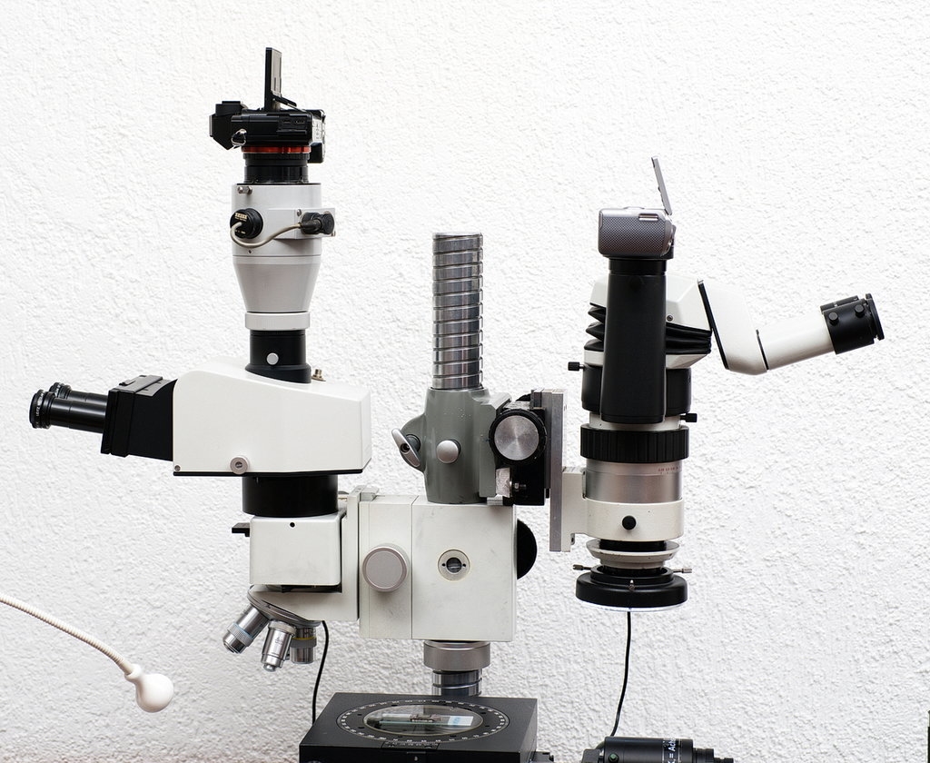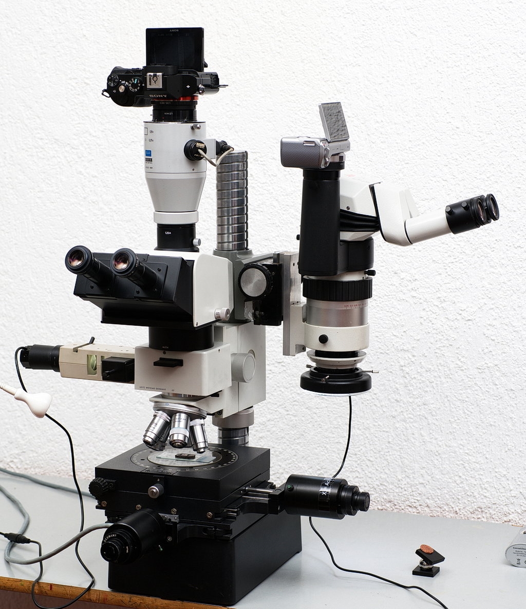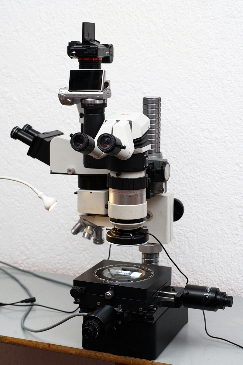 Ein Leitz Messmikroskop (AL,DL,DF), ein Wild Stemi, Kameras von Sony.