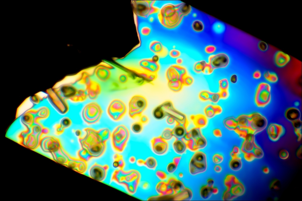 Hier noch ein paar Bilder. Das dritte ist wieder im UV-Licht aufgenommen (Taschenlampe). Eigentlich ohne konkretes Ziel, aber da der Aufbau schon mal stand, habe ich auch gleich noch einen Stack mit UV-Licht gemacht. Die blauen Reflexionen im rechten Teil des Bildes stammen von der Klebemasse, die im Streulicht blau geleuchtet hat. Lag zwar außerhalb des Fokus, aber die Reflexionen...