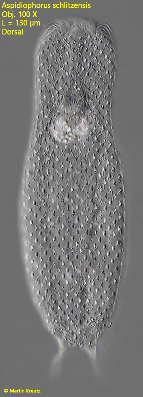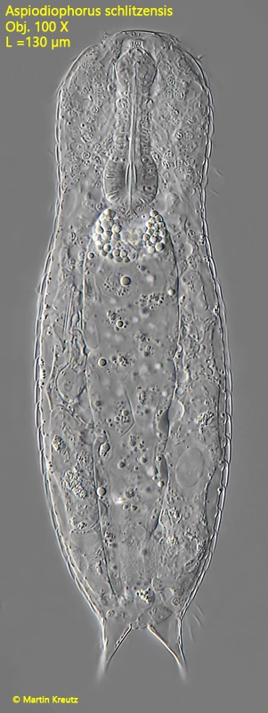 Bei dem zweiten Gastrotrichen handelt es sich um Aspidiophorus schlitzensis. Er ist mit 130 µm Länge genauso so klein wie Ichthydium bifurcatum und man muss mit Öl ran, um die Merkmale genau zu erkennen. Hier zwei Aufnahmen des noch nicht komplett gequetschten Exemplares: