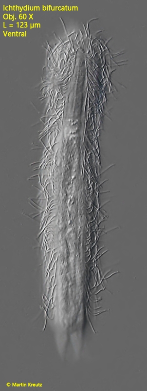 Zuerst der kleine und zierliche Gastrotrich Ichthydium bifurcatum. Der ist sofort erkennbar an den aufgespaltenen Zehen (Kleberöhrchen), die allerdings erst bei der Betrachtung mit dem 40 X gut sichtbar werden. Außerdem hat Ichthydium bifurcatum eine eckig vorstehende "Schnauze" (Kephalion), wie man auf den Fotos andeutungsweise erkennen kann. Leider habe ich das Exemplar nur von ventral erwischt, aber die Dorsalseite soll keine Schuppen tragen: