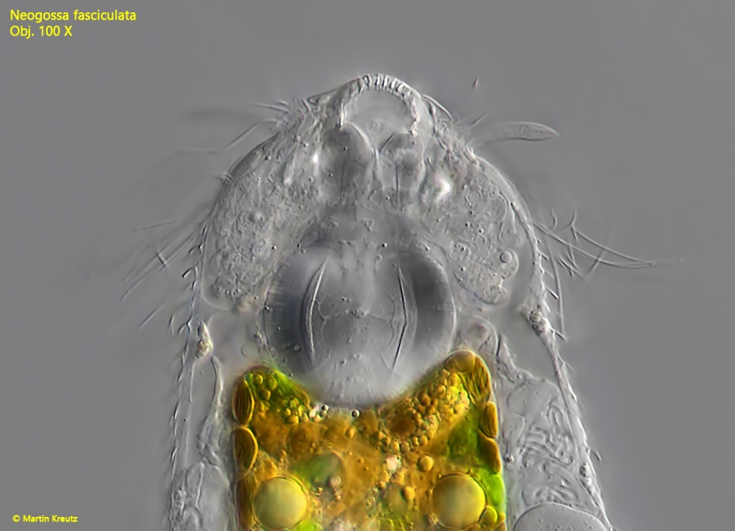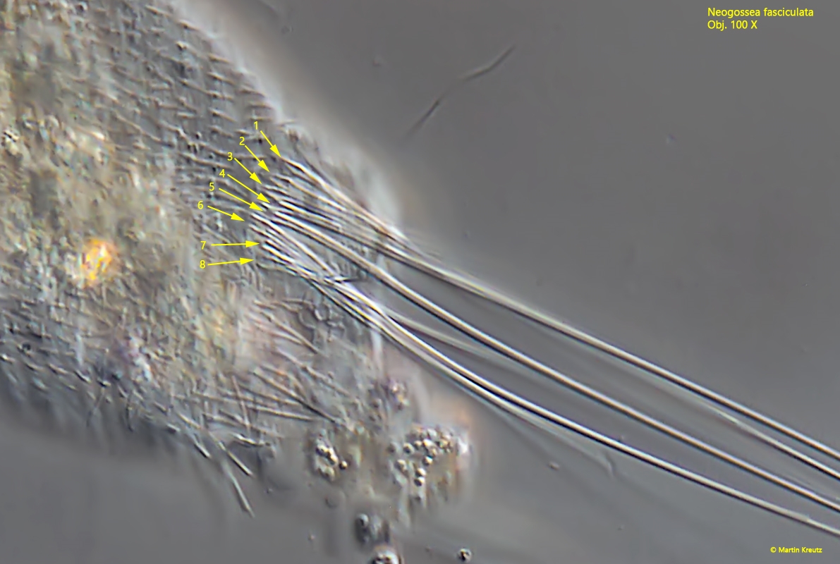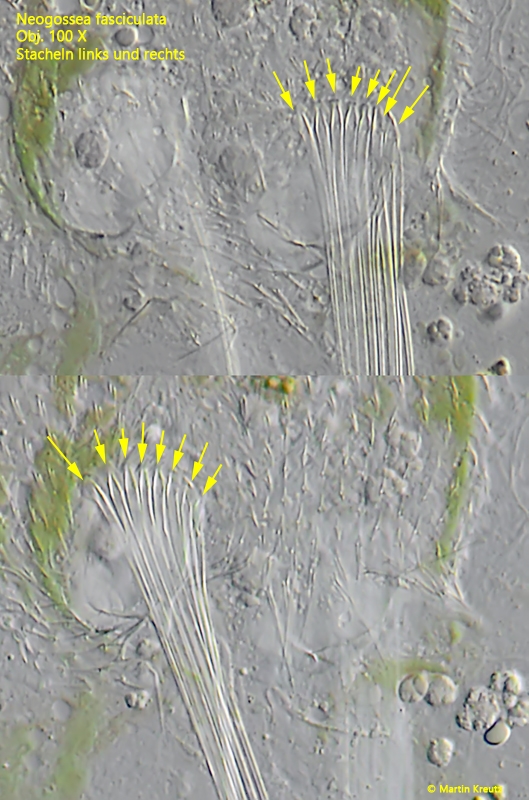 Wenn es keine neue Art ist, handelt es sich dann bei Deinem Exemplar eindeutig um Neogossea fasciculata. Erstaunlich, dass diese Art bei Dir häufig vorkommt, aber auch seltene Arten können eine erstaunliche lokale Abundanz erreichen. Wenn Du Gelegenheit hast, solltest Du Dir die Tiere unbedingt genauer anschauen. Die Neogosseiden sind wirklich eigenartige und nur unzureichend untersuchte Gastrotrichen. Ich bin sicher, dass sie niemals mit der Dir zu Verfügung stehenden Beobachtungsqualität erforscht wurden. Da würde mir sofort ein umfangreicher "Wunschzettel" einfallen: