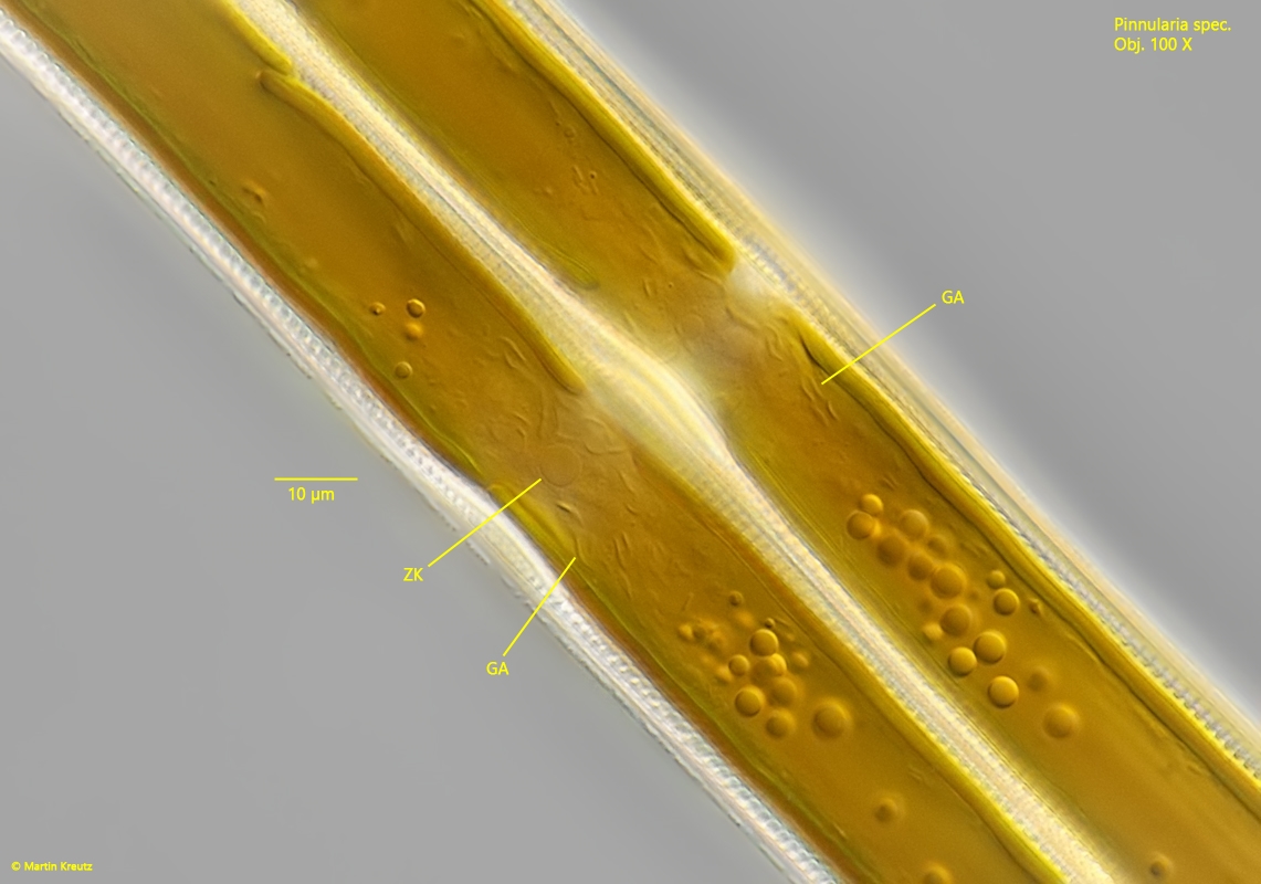 ich fand Deine Beobachtung der Strukturen um den Zellkern von Pinnularia sehr interessant. Das es sich um den Golgi-Apparat handelt, hätte ich selbst nicht gedacht und erst im Laufe dieses threads erfahren. Jetzt wollte ich mir die Sache mal selber anschauen und habe schon beim ersten Exemplar von Pinnularia die Strukturen ebenfalls deutlich erkennen können. Sie scheinen in Pinnularia immer so deutlich sichtbar zu sein. Ich habe unten noch ein Fotos angehängt, wie sie bei mir aussehen.