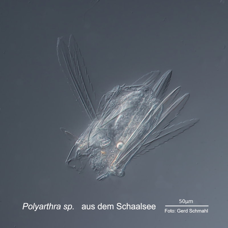 im meinem Urlaub am Schaalse habe ich wiederholt das Planktonnetz geschwungen und dann meist direkt mit dem Reisemikroskop die Proben bewundert. Nach 5 Stündiger Rückfahrt, war die kurz vor der Abreise gezogene Probe natürlich trotz Lagerung in der Reisekühlbox zu großen Teilen hinüber. Für das Fotografieren von Polyarthra, dem Schwertborsten-Rädertier war das allerdings von Vorteil. Diese Tiere können sich ja Dank ihrer Borsten "teleportieren", wie in diesem älteren Beitrag beschrieben.