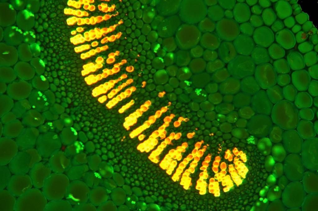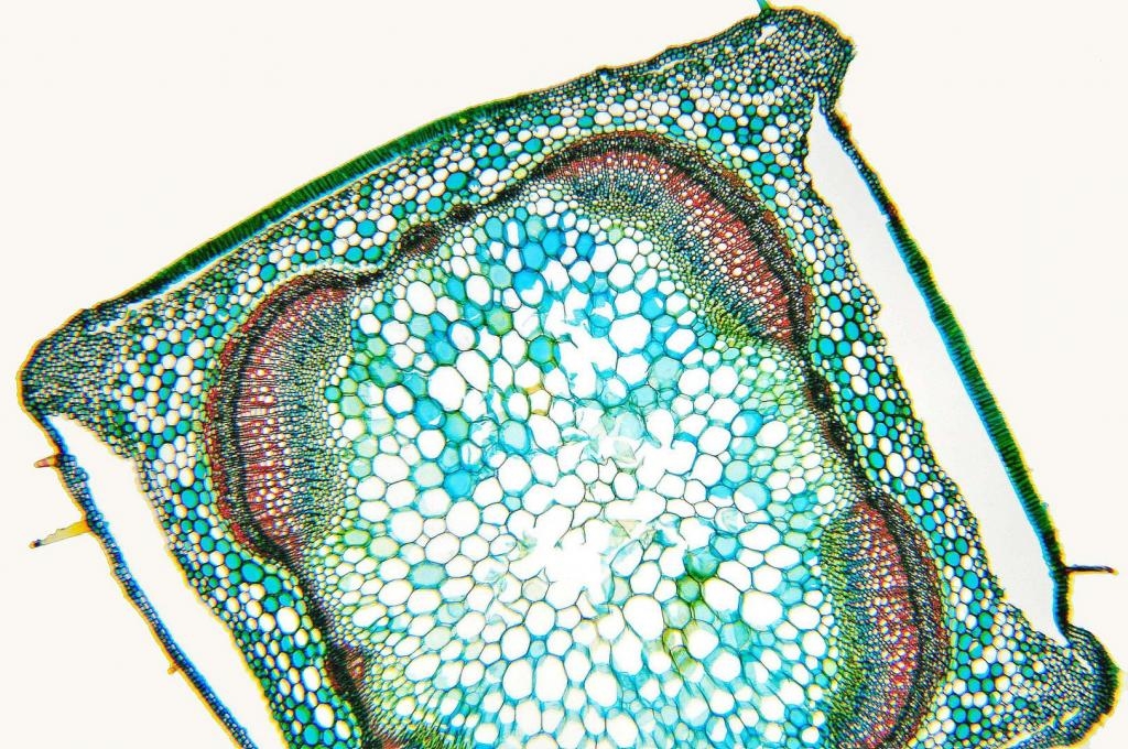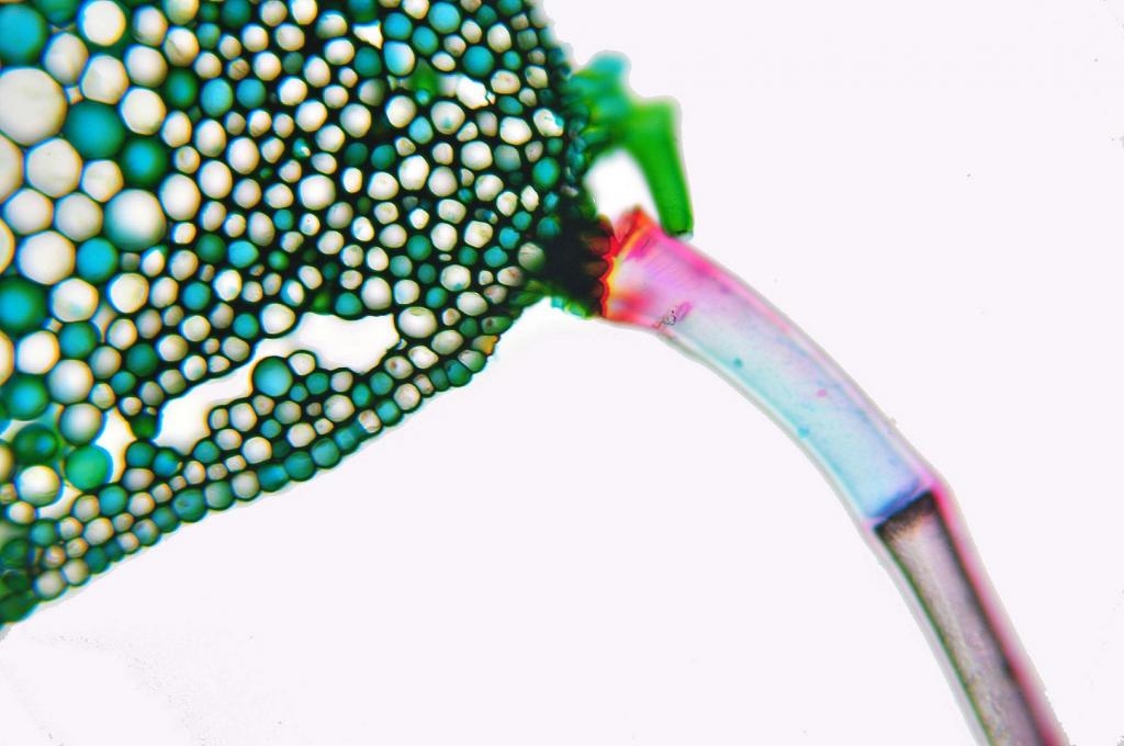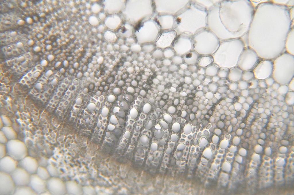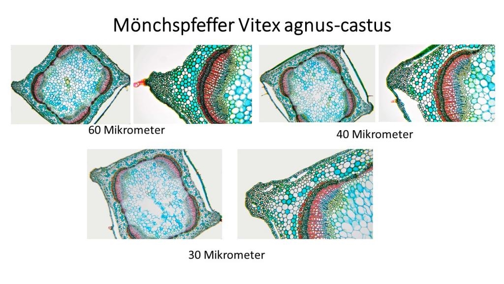 Bei einer Schnittdicke von 60 Mikrometer liegen mehrere Zellschichten übereinander, das Markparenchym ist komplett erhalten. Die Färbung ist kräftig.