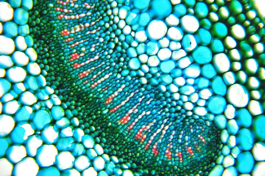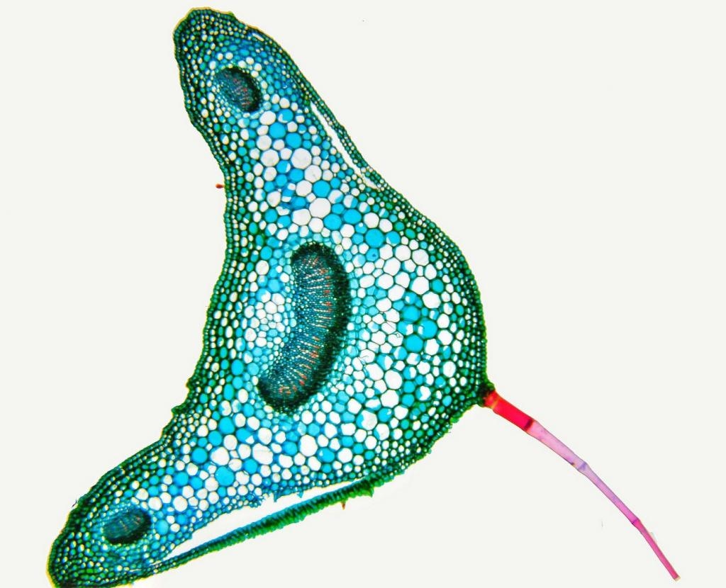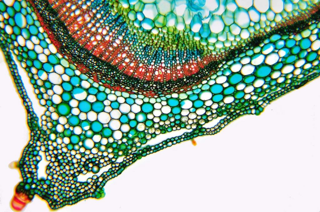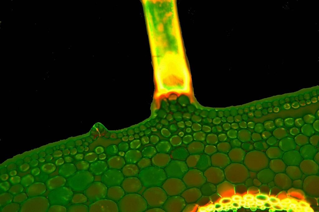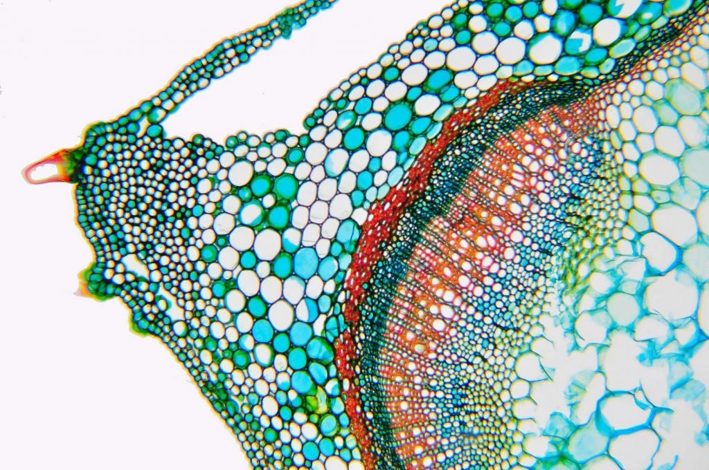 Bei einer Schnittdicke von 60 Mikrometer liegen mehrere Zellschichten übereinander, das Markparenchym ist komplett erhalten. Die Färbung ist kräftig.