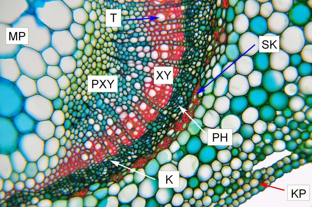 MP = Markparenchym, T = Trachee, PXY = Protoxylem, XY = xylem, K = Kambium, PH = Phloem, SK = Sklerenchymring, KP = Kantenparenchym
