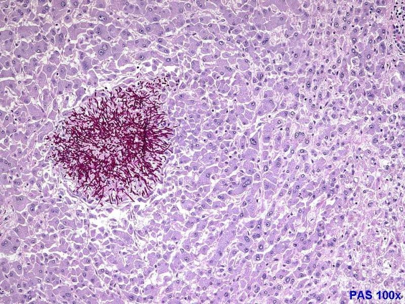 Mit die PAS Färbung wird Glykogen Rot/Purper angefärbt also könnte das eine Glykogenkrankheit sein??