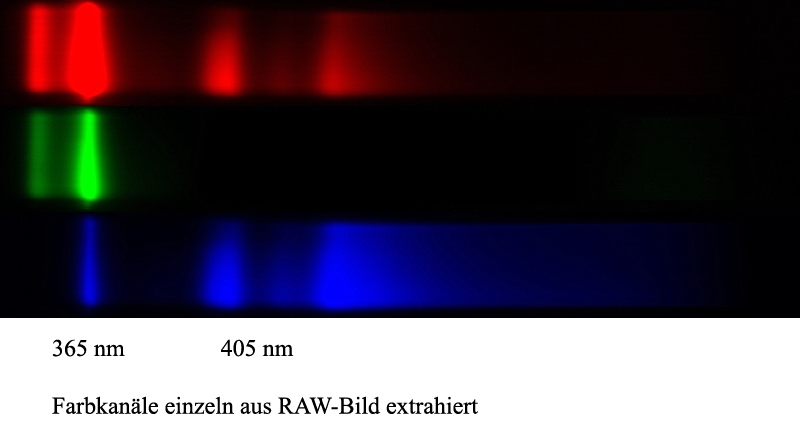 Das Licht  mit 365 nm Wellenlänge regt sehr intensiv die R-Pixel an,