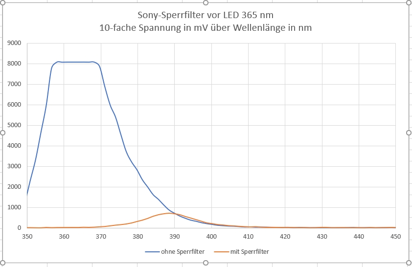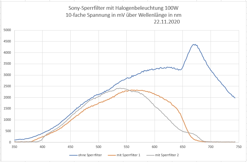 Ich habe den Einfluss eines Sony-Sperrfilters im 400nm-Bereich untersucht (rote Kurve).