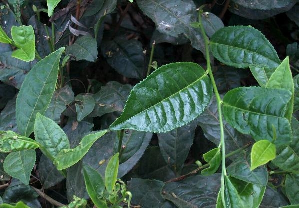 Da die Blattoberseite der Teeblätter glänzend und glatt ist (Bild aus Wikipedia Commons):