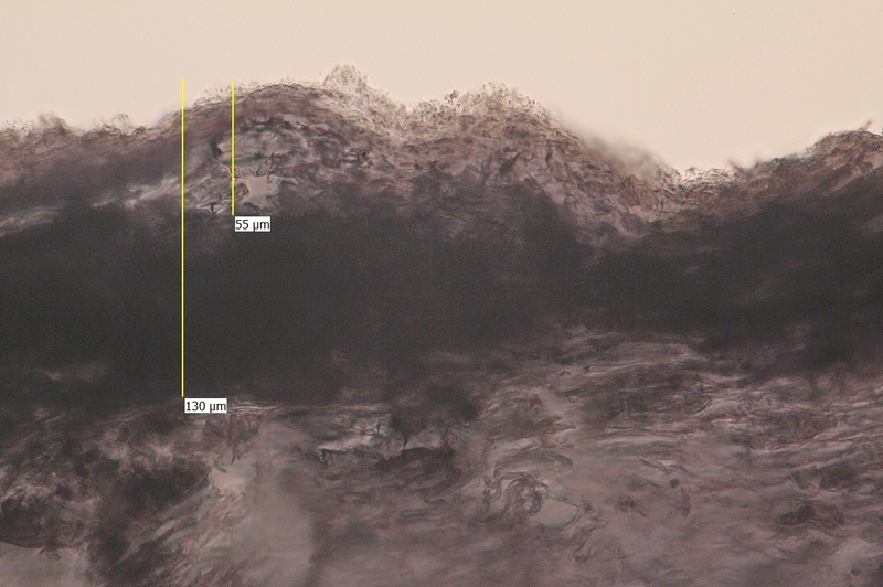 Man kann verschleimte Hüte von Frischpilzen tiefkühlen und in diesem Zustand manuell oder mit dem Mikrotom sauber schneiden. Bild 9 zeigt das Ergebnis eines manuellen Schnittes mit Rasierklinge unter dem Stemi. Es ist erkennbar, dass die Schleimschicht etwa doppelt dick gegenüber den Schnitten vom Exsikkat ausfällt, und die Hyphen verlaufen beim "Gefrierschnitt" weniger flach: (Ixotrichoderm):