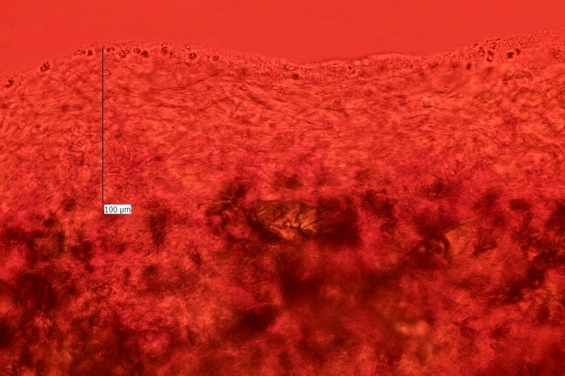Da die Hutoberfläche wegen ihrer klebrigen bis schleimigen Konsistenz nicht im frischen Zustand geschnitten werden konnte, wurde erst einmal ein Exsikkat angefertigt. Der trockene Hut wurde dann vorsichtig manuell mit scharfer Rasierklinge quer geschnitten und zum einen in NH3-Kongorot, zum anderen in Tannin-Eisen angefärbt (Bilder 6 und 7).