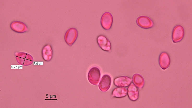 Sporen ellipsoid bis oval, hyalin, glatt. Sie wurden zum einen in Phloxin und zum anderen in Wasser gemessen. Dabei stellte sich heraus, dass man in Phloxin gegenüber Wasser vergleichbare Messwerte erhält.
