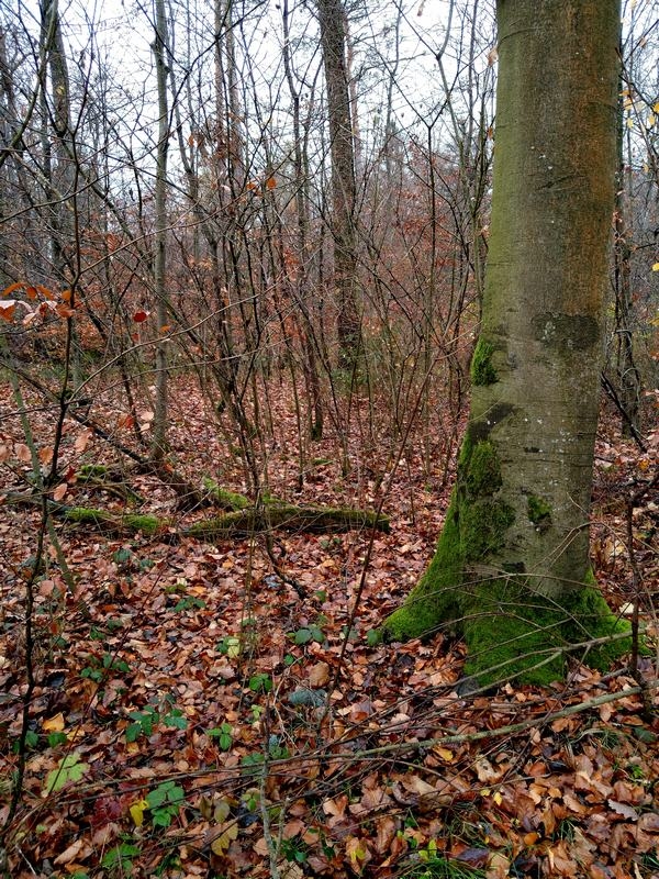 Bild 1 - Das Fundgebiet. Bei Rotbuchen auf Kalkboden, Halbschatten, Spätherbstaspekt