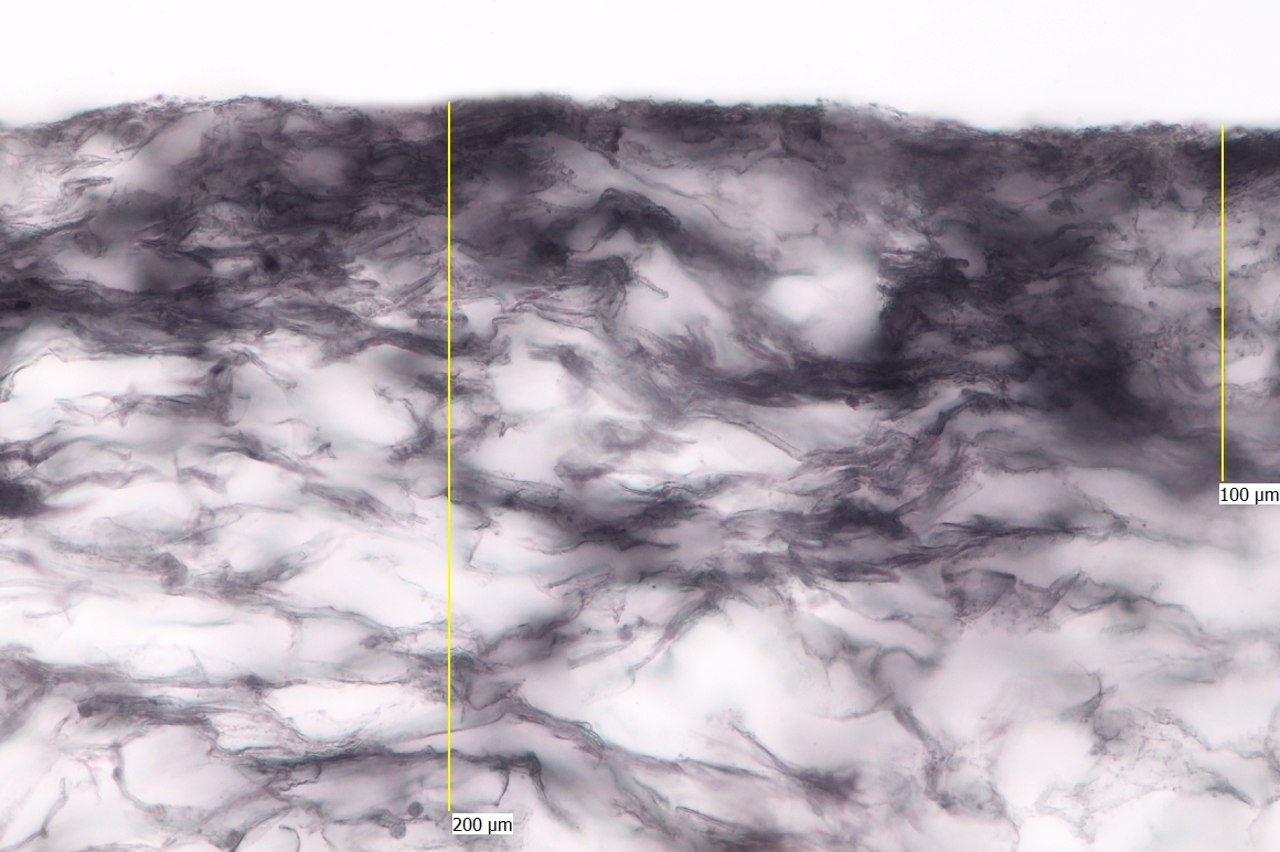 Bild 8 - 30 µm dicker, tangentialer Mikrotomschnitt der Huthaut vom Exsikkat mit Tannin-Eisen-Färbung, 25-fach Objektiv.