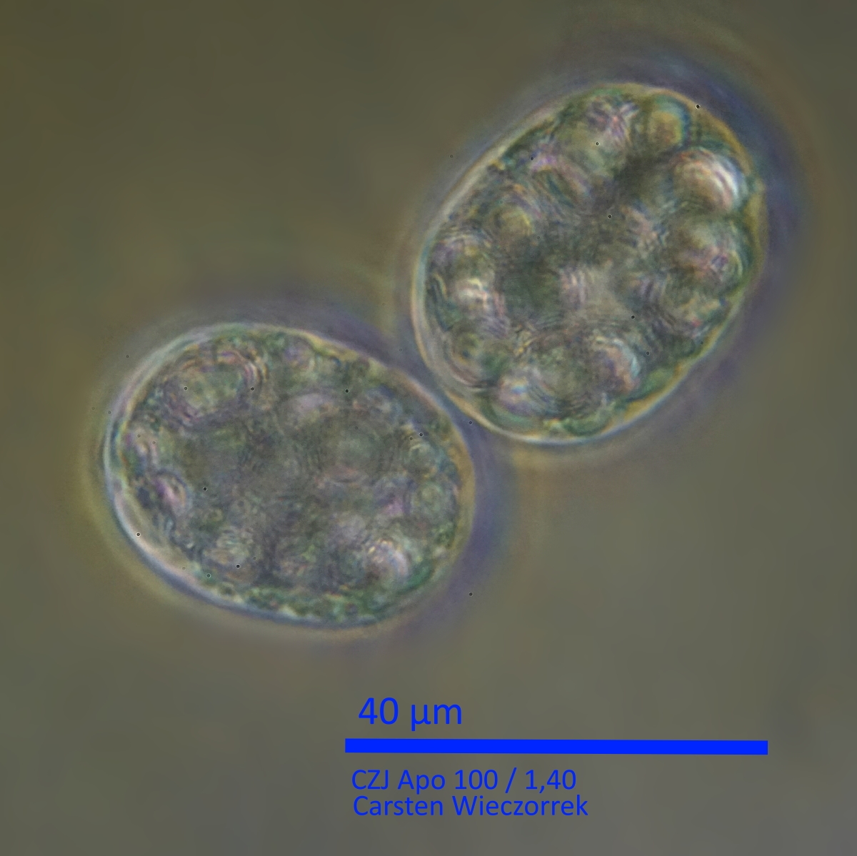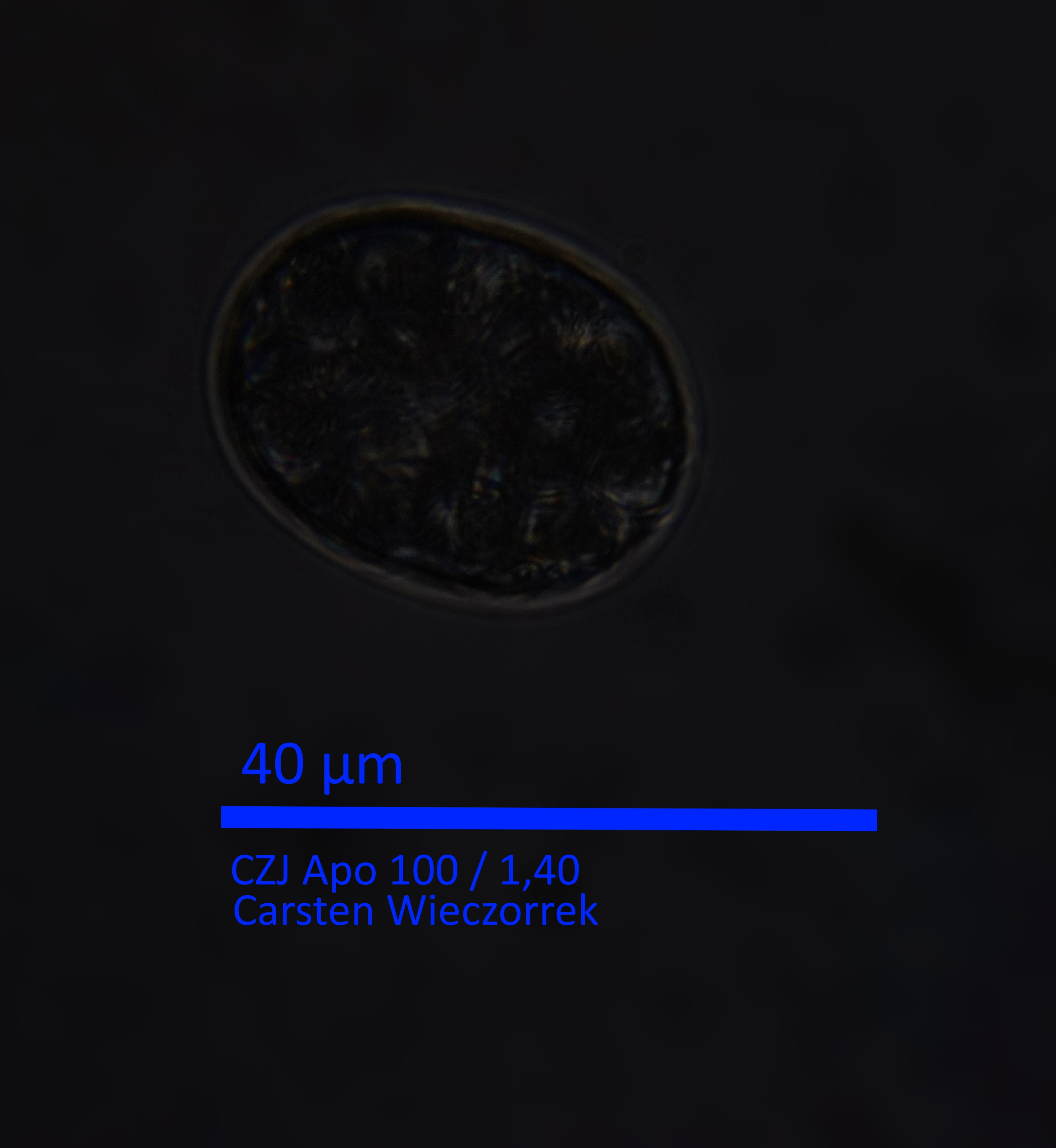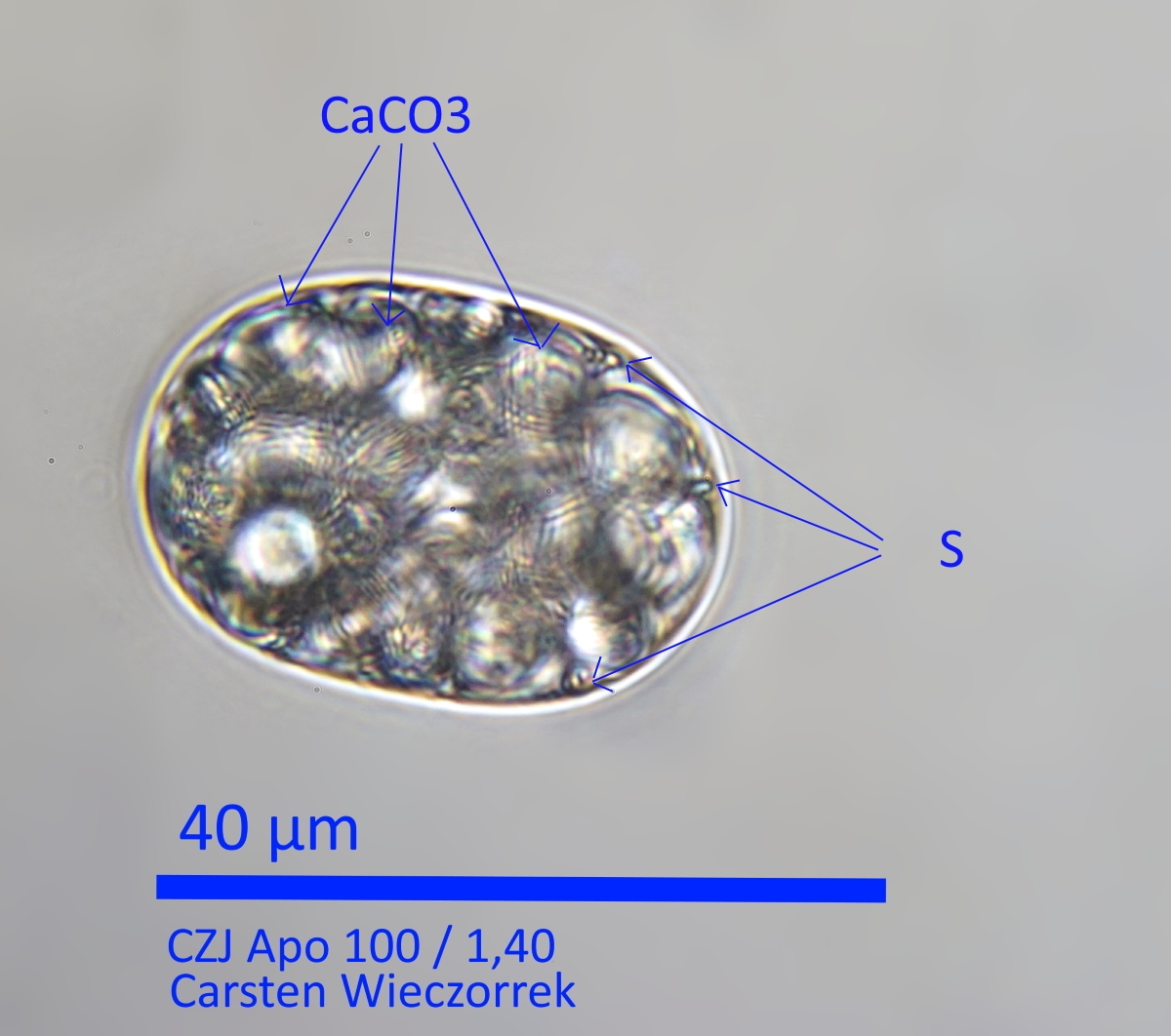 Das Bakterium gehört zu den Schwefelbakterien und lebt in der obersten ca. 1 cm Schicht des Faulschlamms aller Seen, also genau an der Grenze zwischen sauerstoffhaltig/sauerstoff-frei. Es verstoffwechselt Schwefelwasserstoff über die Zwischenstufe elementarer Schwefel bis zur Schwefelsäure, also von der Oxidationsstufe S2- bis zu S+6. Für die Oxidation kann das Bakterium auf Nitrat zurückgreifen aber auch Sauerstoff direkt veratmen (5). Dabei wird der Schwefel als Zwischenprodukt in Form kleiner Kügelchen zwischen den Kalkteilchen im Zellinneren eingelagert. Trotz seiner Größe und des Schwefelgehaltes wird auch dieses Bakterium von großen Cilliaten und Mehrzellern gefressen und sogar von Pilzen befallen (6). Bild 2 zeigt ein Bakterium im Hellfeld, aufgenommen mit dem Apo 100/1,4.