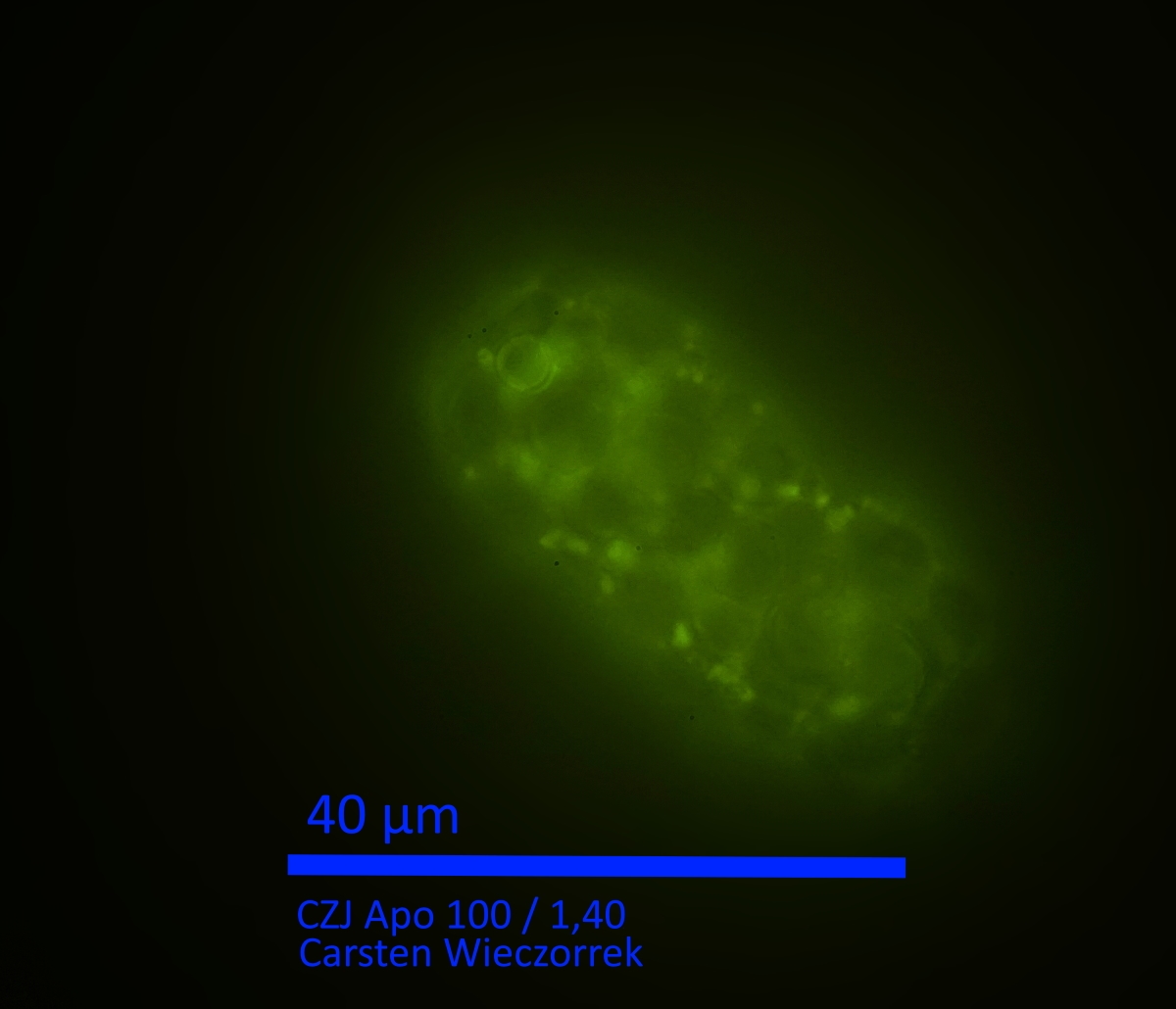 Zu meiner Überraschung zeigt das Bakterium selber Autofluoreszenz, die Kalkpartikel aber nicht. Man kann hier sogar die inneren Membranen erkennen, die ich mit Acridin Orange nicht darstellen konnte. Auch die Schwefelkörnchen scheinen zu fluoreszieren. Auf Aragonit-Kristalle deutet das nun nicht eindeutig hin, Aragonit kann aber auch nicht ausgeschlossen werden. Da man aber die Membranen recht gut erkennen kann, kann ich mir wohl die 280 EUR für das Nile Red sparen. Ist es in dem Zusammenhang vielleicht Möglich, dass die Kalkpartikel dem Bakterium als Lichtschutz dienen? Zumindest den oberflächennahen Individuen? Wenn man bedenkt, dass viele Cilliaten schon nach 10 sek. Blaulicht-Bestrahlung platzen, kann man diese Dinger 10 min. lang mit 365 nm braten, und da passiert nichts. Gut, das die nicht zu den pathogenen Keimen gehören (Einstufung nach Bundesanstalt für Arbeitsschutz in Risikogruppe 1 = ungefährlich (13)), die einfache UV-Desinfektion wird da wohl nicht funktionieren. In den Publikationen wurden hauptsächlich Säureschutz und Trimm-Körper (Auftrieb bzw. Abtrieb) diskutiert sowie eine Rolle im Schwefel-Stoffwechsel.