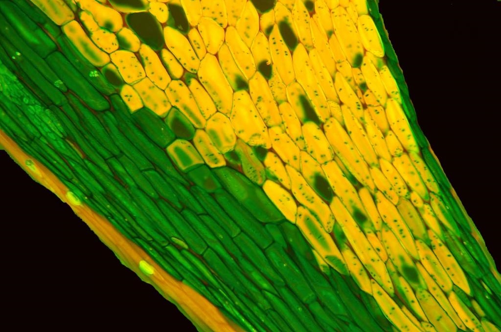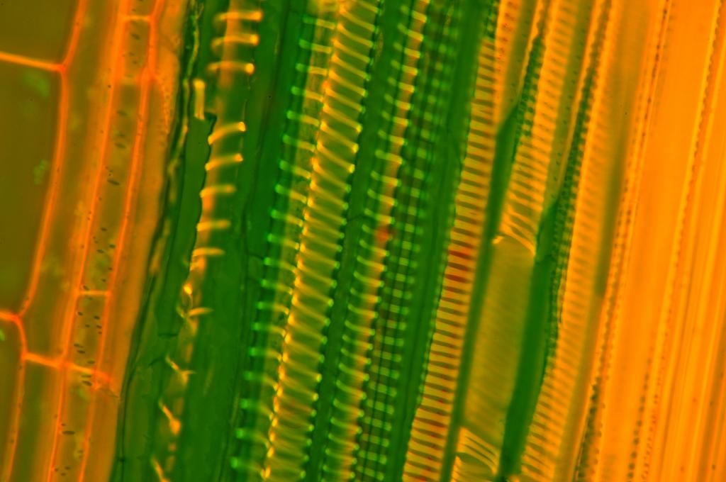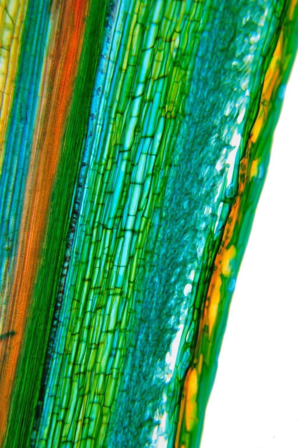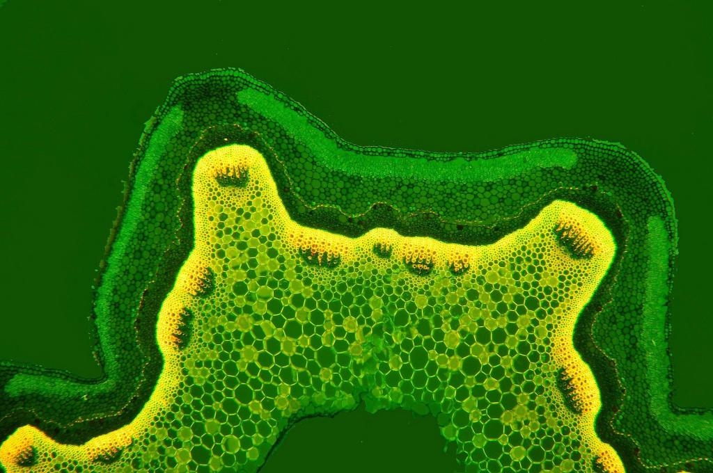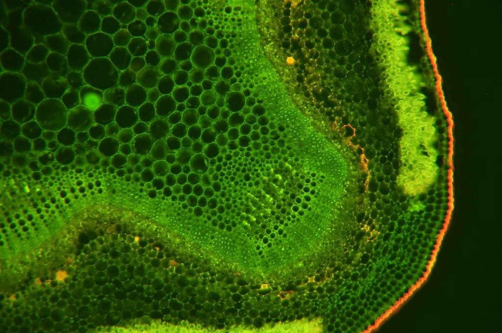 Beim "Assimilationsparenchym" denke ich eher an nicht verholzte Fasern. Chlorophyll würde in der Autofluoreszenz schwach rot leuchten, hier kommt aber grün zurück, wie beim Xylem des Querschnittes.