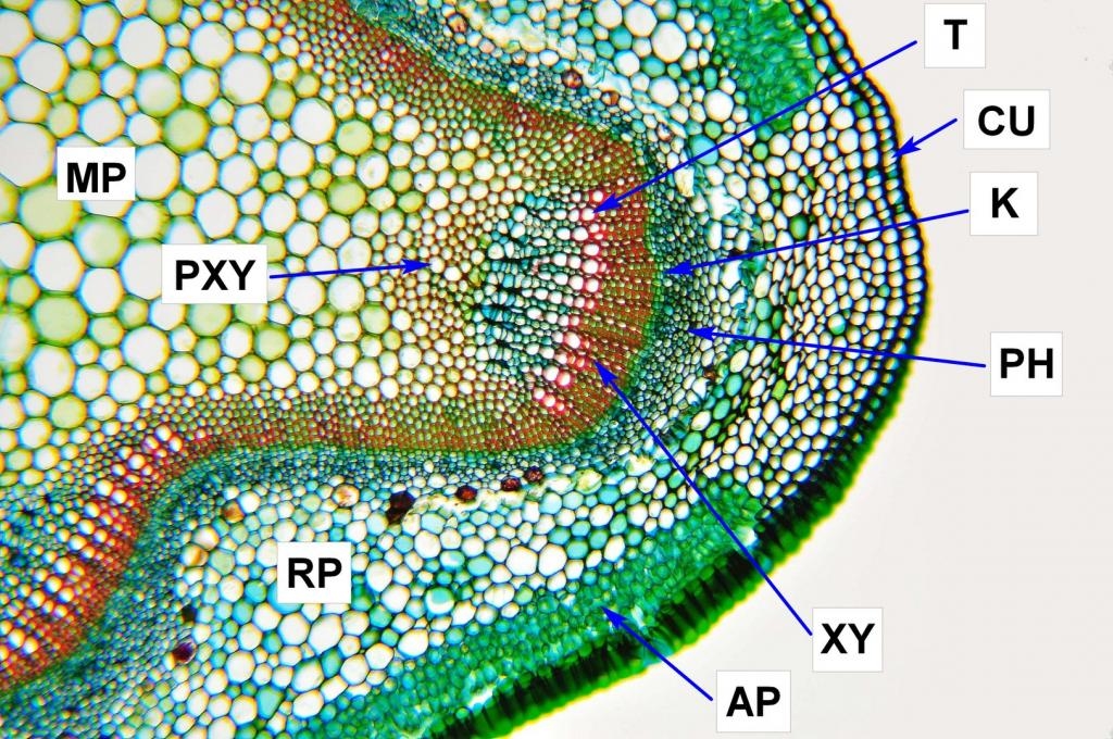 MP = Markparenchym, PXY = primäres Xylem, RP = Rindenparenchym, T = Trachee, CU = Cuticula, K = Kambium, PH = Phloem, XY = Xylem, AP = Assimilationsparenchym ?