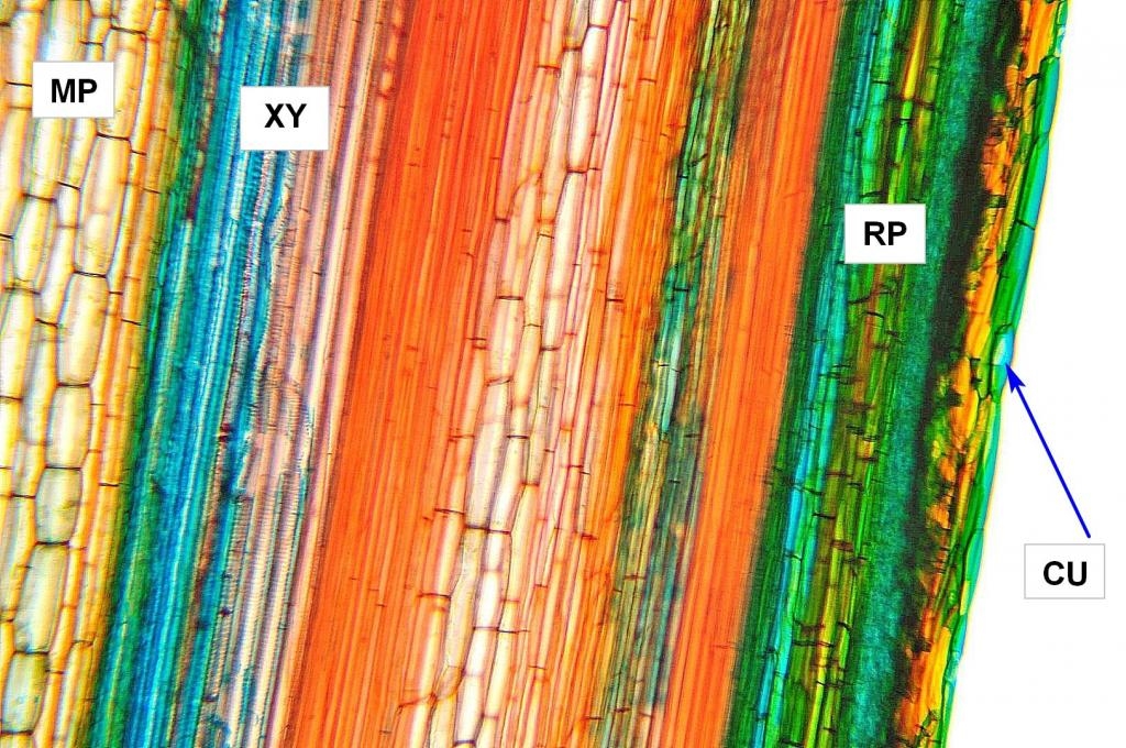 MP = Markparenchym, XY = Xylem, RP = Rindenparenchym, CU = Cuticula