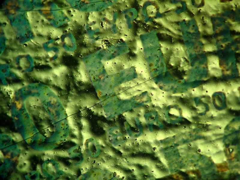 Also ich gehe mal davon aus, dass der braune Hintergrund nicht dazu gehört. Dann würde ich vermuten, dass es sich um ein hauchdünnes gewalztes Stück einer kupferhaltigen Legierung in einer Dicke wie etwa Blattgold ist. Einige Stellen sind blank, andere grünlich oxidiert. Sieht mir so aus, als wenn es oben durch abkratzen diese zwei Kerben erhalten hat. Die sehen erst mal recht technisch aus, sind aber doch unterschiedlich geformt. Es gibt da so Glücksspiele, wo man was gedrucktes frei kratzen muss oder vielleicht die Banderole beim Pils. Weis nicht, ob die grün wird. Ist vielleicht Essig dran gekommen, sehr spekulativ aber mehr fällt mir grade auch nicht ein.