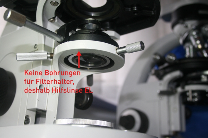 Hat dein Kondensorträger unten Bohrungen zum Befestigen eines Filter-/Linsenhalters? Den könntest du dann nachrüsten, um die Hilfslinse 1 zu verwenden und bei Bedarf bequem wegklappen zu können. Die Hilfslinse EL, die in den Kondensor geschraubt wird, ist in meinen Augen nur eine Notlösung für Modelle ohne Hilfslinsen-Halterung und ohne Möglichkeit der Nachrüstung, dort macht sie natürlich Sinn, wie hier an der allereinfachsten Basisversion eines Standard RA (vorne ohne, im Hintergrund das RA mit Halterung):
