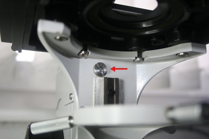 Nun zum Problem: Beim Köhlern bekomme ich die Leuchtfeldblende nicht scharf. Der Kondensor müsste noch ein kleines Stückchen weiter nach oben, aber erstens ist da eine feste "Nase", die den oberen Anschlag bildet (siehe Bild mit Pfeil), und zweitens befindet sich die Frontlinse des Kondensors in der obersten Stellung schon ganz knapp unter dem Objektträger. Das 3,2x und das 10x bieten genug Platz, um den Tisch samt Kondensor noch ein bis zwei Millimeter anzuheben - dann ist die Leuchtfeldblende scharf, aber das Präparat nicht mehr.