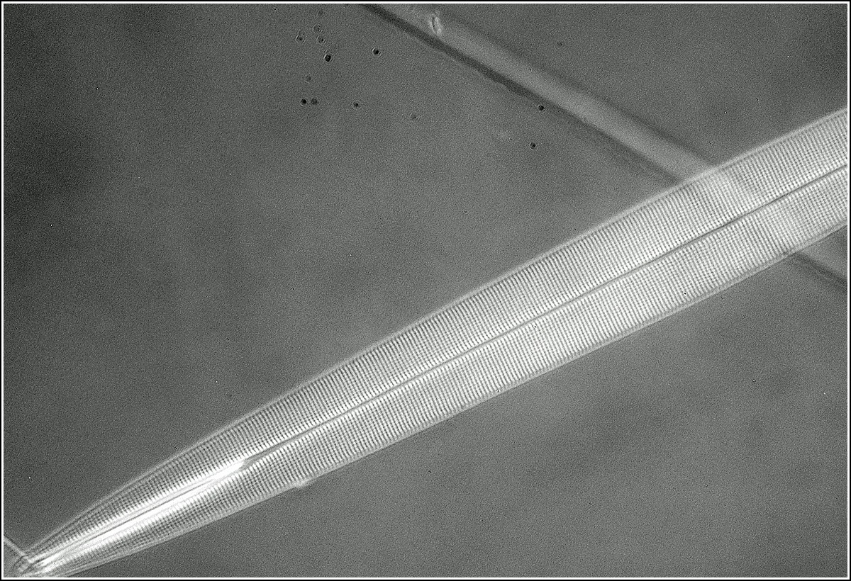 Da hat jetzt das Speedax wirklich geholfen, "pellucida" heisst ja nicht umsonst "durchsichtig", und das Erkennen / Auflösen der Poren scheitert meistens eher am Kontrast als an der Größe. Bei dieser Session habe ich nichts anderes gemacht als alles zu Köhlern, Polarisatoren rein und eine Diatomee aussuchen, die richtig lag (die Rotation gegenüber den Polarizern ist entscheidend, ob man nur die Striae oder auch die Alveolen sieht - hoffentlich habe ich jetzt keine Fachbegriffe durcheinandergebracht), Blaufilter rein, Kamera an und los. Der Kontrast war deutlich besser, als bei all meinen anderen Amphipleura-Präparaten.