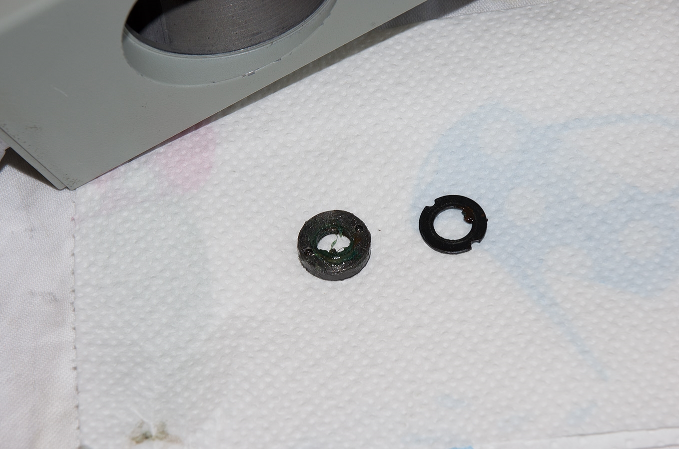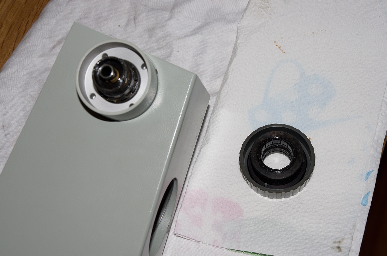 Ab jetzt wurde es interessant, das verharzte Fett in der Bremse war nicht ohne. Das äußere Teil saß absolut fest. Ich wollte hier fast schon wieder aufgeben, aber fluten mit Isopropanol, warten, erwärmen und Geduld haben am Ende den Erfolg gebracht. Ich hatte dazu die Handräder wieder angeschraubt und unter vollem Krafteinsatz hat es dann irgendwann doch nachgegeben.