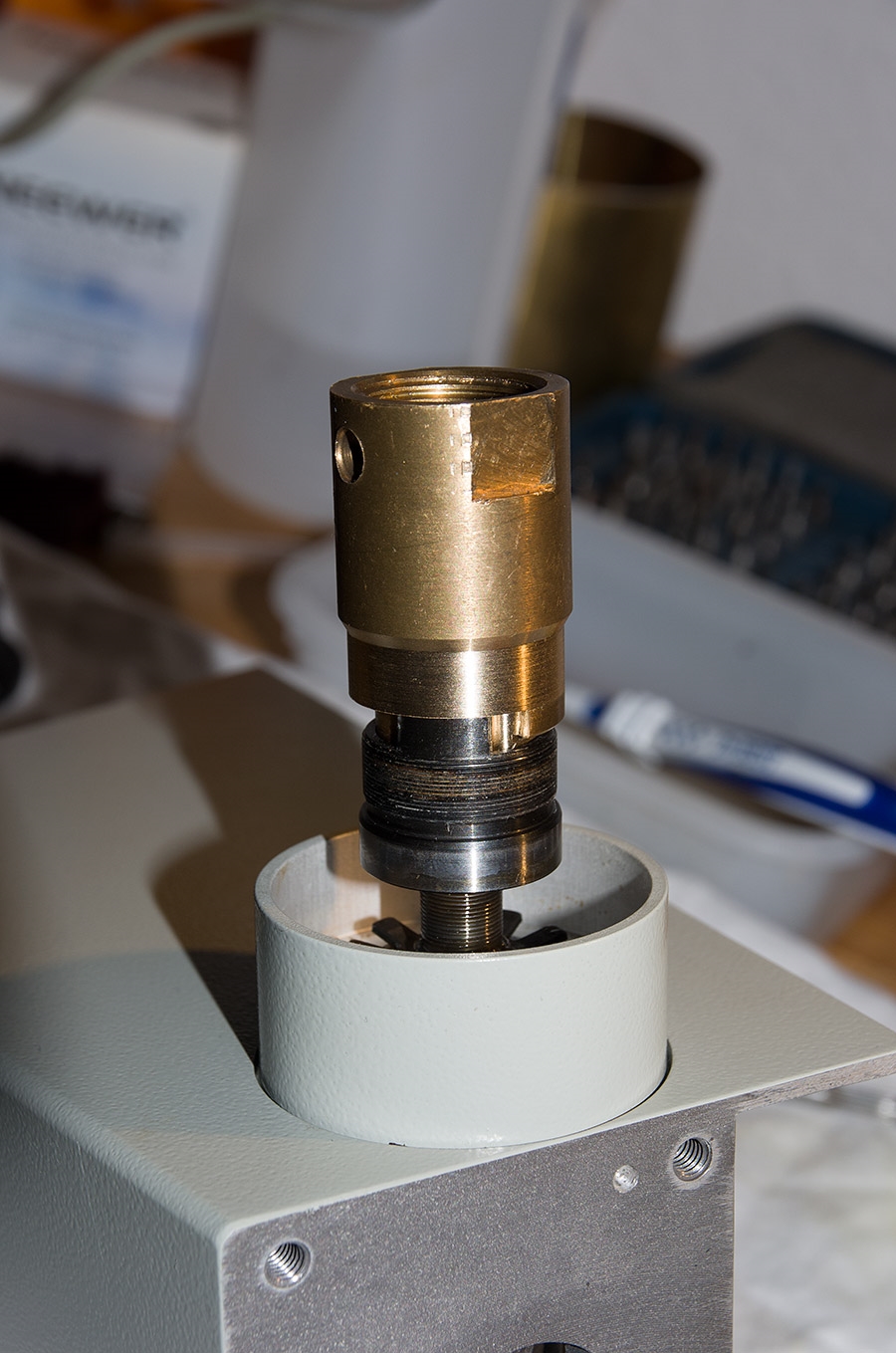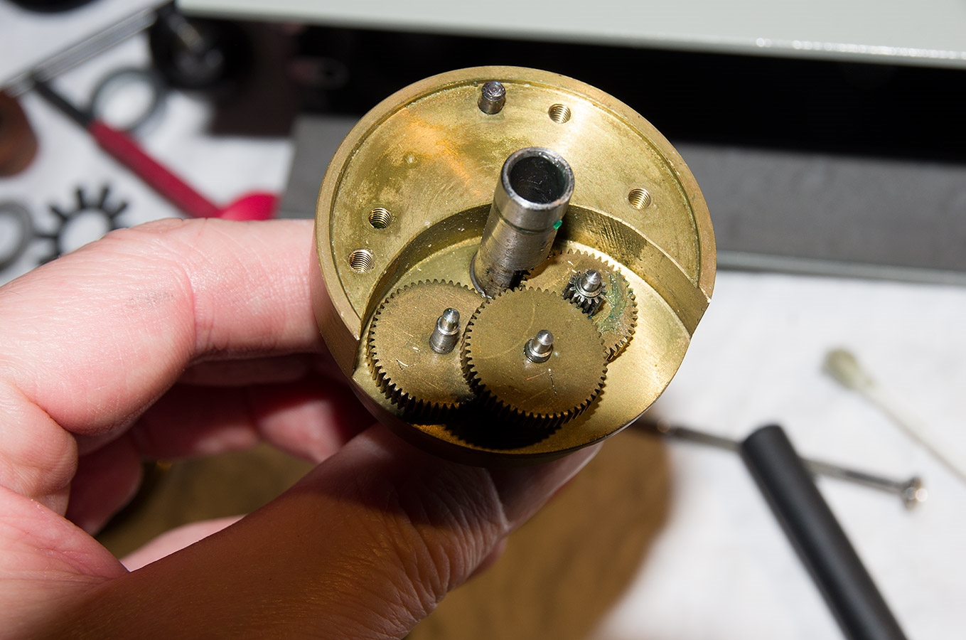 Nun kommt der innere Teil der Bremse zum Vorschein. Das saß mindestens ebenso fest wie das äußere Teil. Dafür habe ich mir aus einem Reststück Messing ein Spezialwerkzeug gebaut. Auch hier hat wieder Isopropanol und erwärmen geholfen.