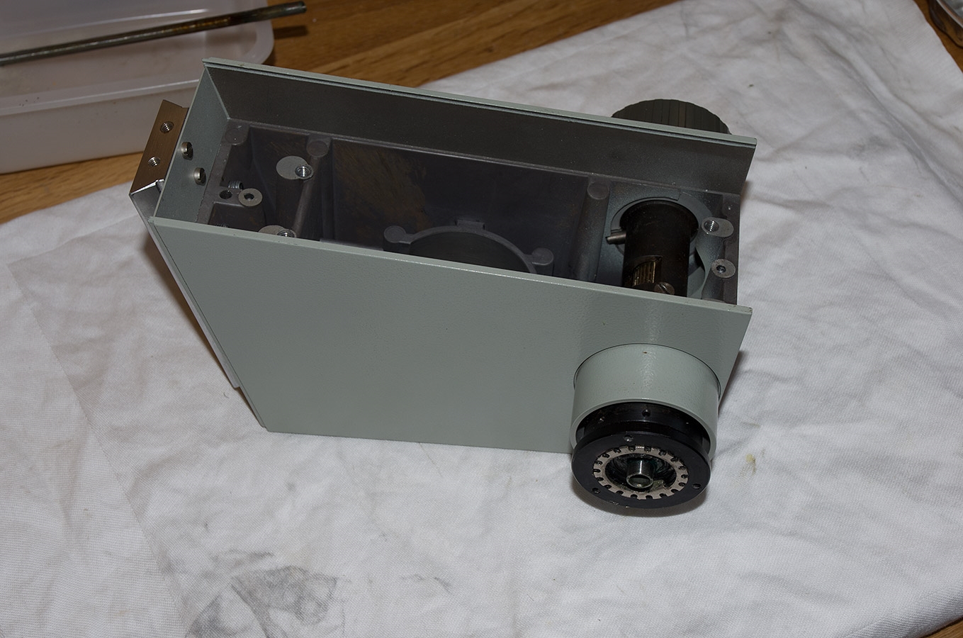Ausgehend von diesem Link https://www.mikroskopie-forum.de/index.php?topic=30576.msg226965#msg226965 hatte ich also den Schlitten und Feintrieb demontiert und nun sollte es dem Grobtrieb an den Kragen gehen.