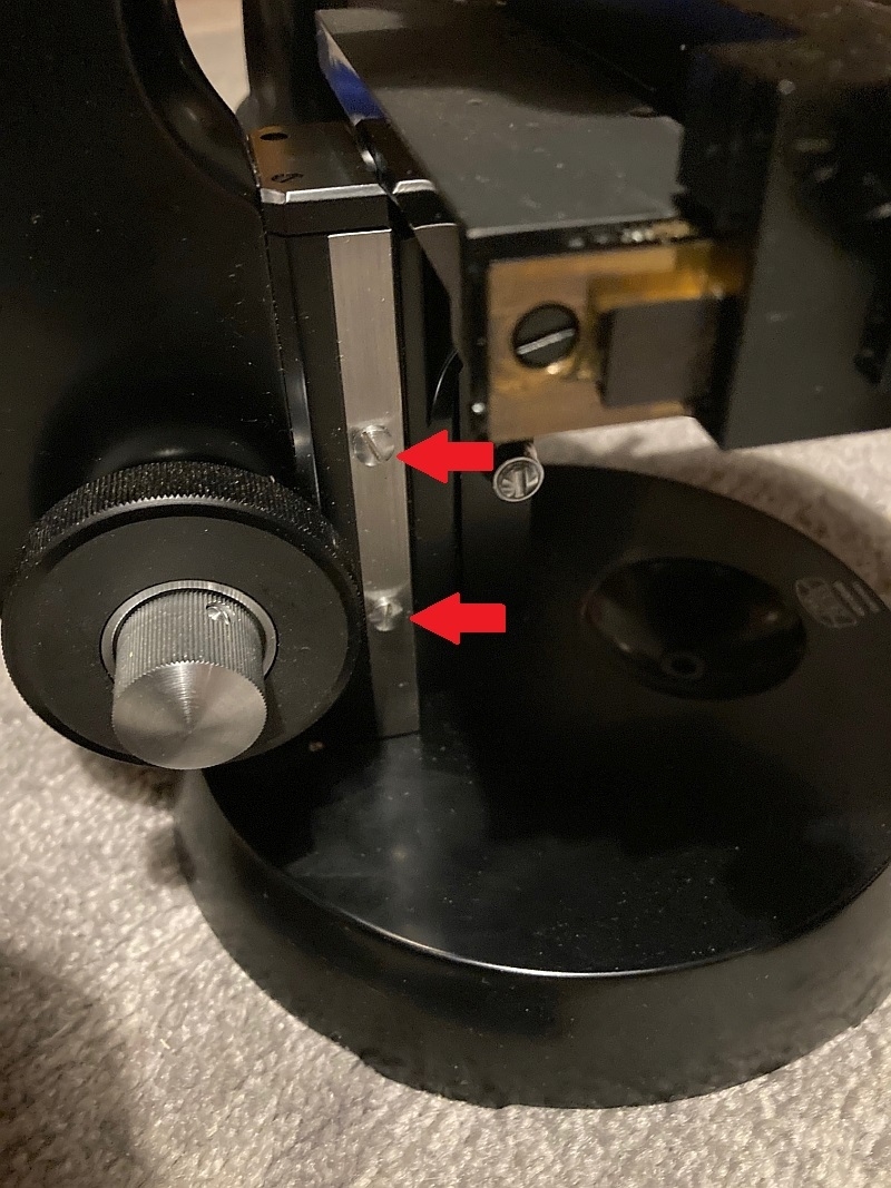 Die letzten beiden Versionen haben bei allen Junior Mikroskopen die ich besitze eine Walzenführung der Tischhöhenverstellung (markiert mit dem roten Doppelpfeil):