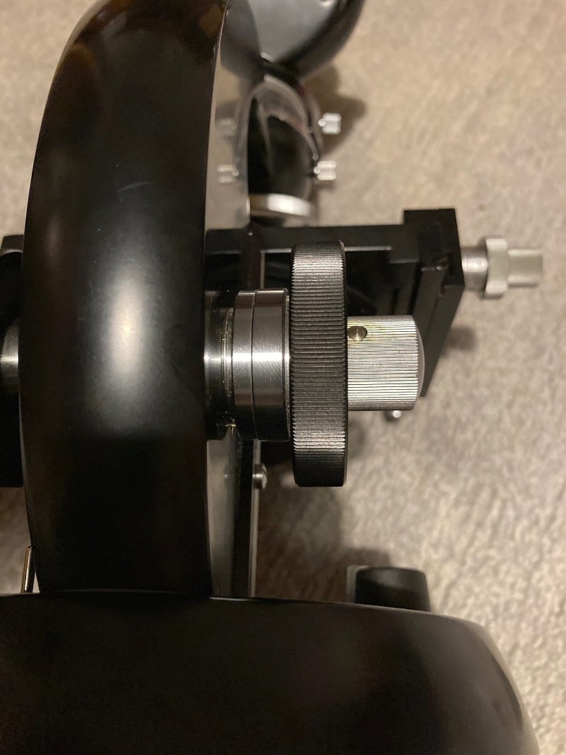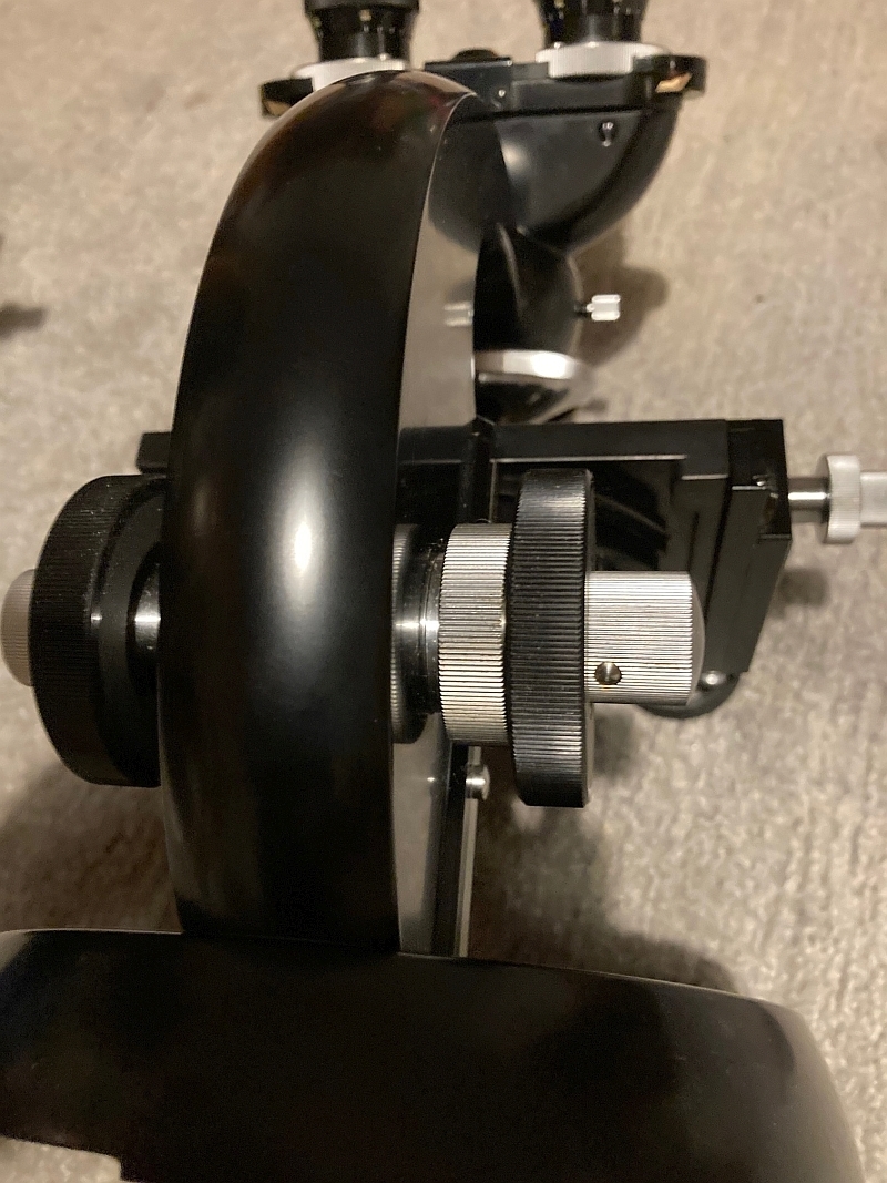 Hier die Variante mit der geschlitzten dickeren Achse, welche ein Verstellen der Friktion des Reibradantriebs ermöglicht, nur dass man da mit den Fingern nur schwer hinkommt um diese gefühlvoll einzustellen. Meist ist der Trieb ohnedies so verharzt,  dass sich da eh nichts mehr verstellen lässt. Diese Version finde ich auch an meinen Standard KF Mikroskopen offensichtlich wurde sie aber nicht nur dort sondern auch an Junior Mikroskopen verbaut: